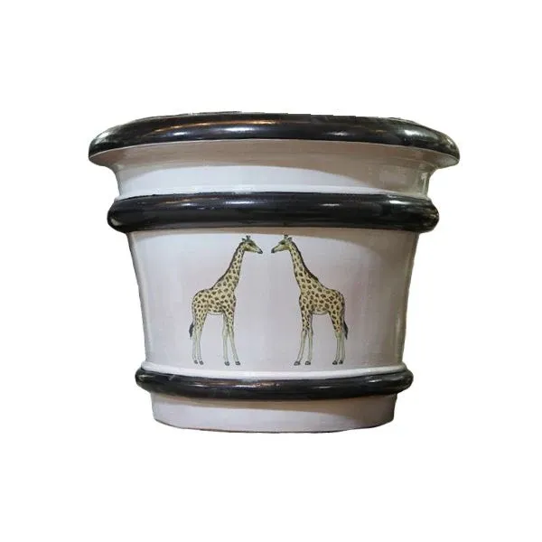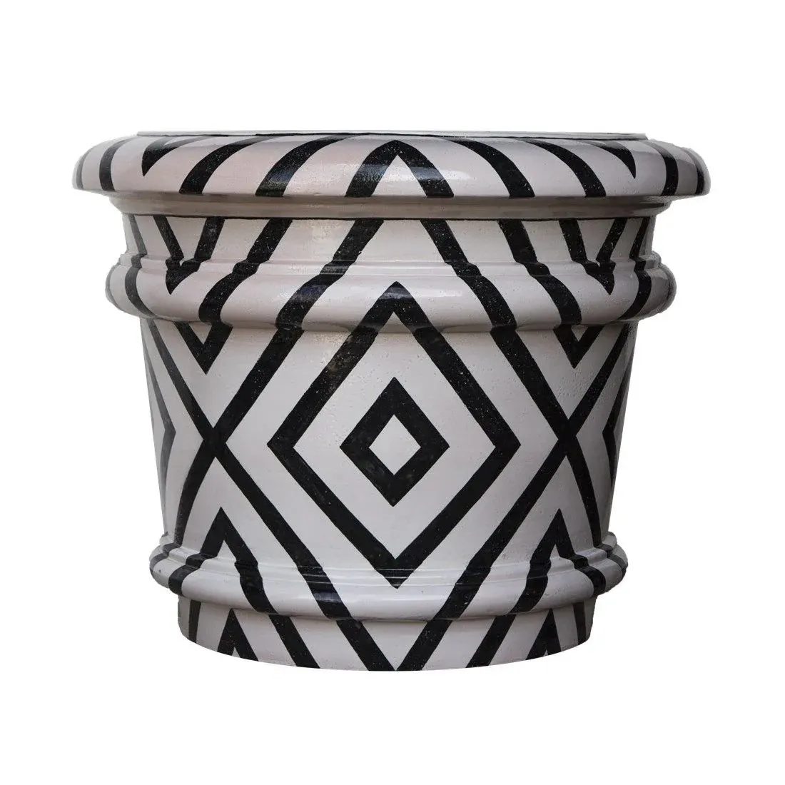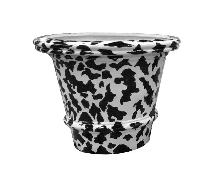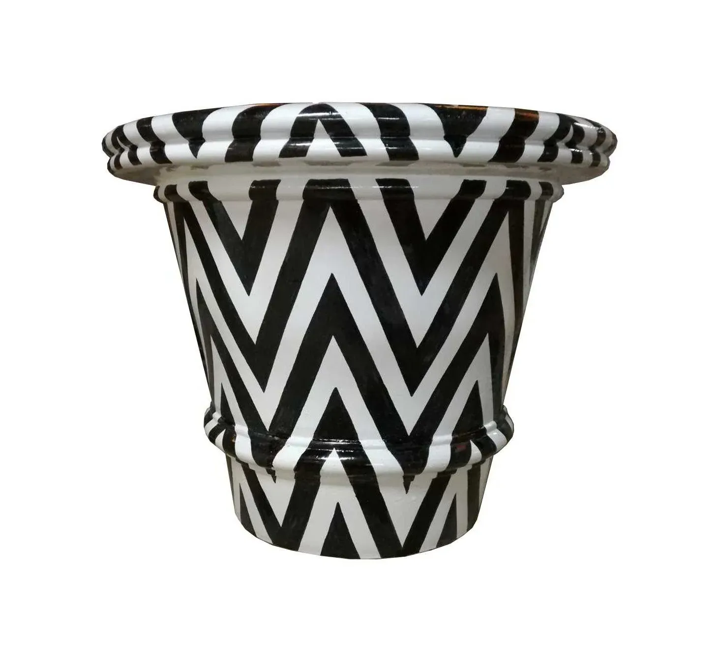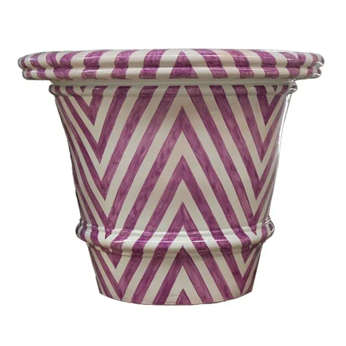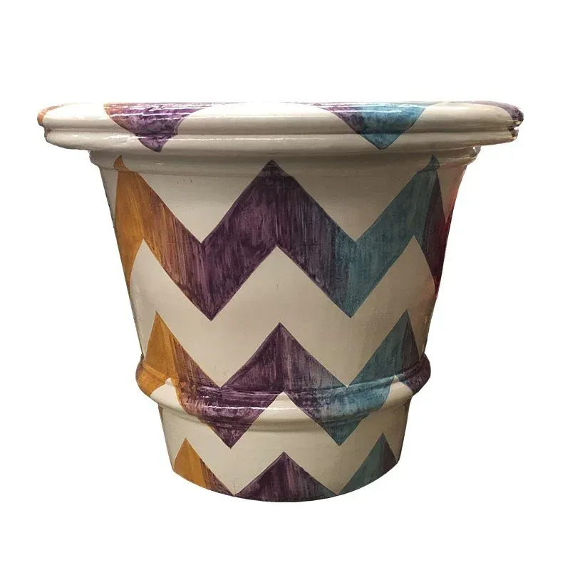 Preciosa maceta contemporánea de cerámica, prensada y pintada a mano con motivos geométricos.