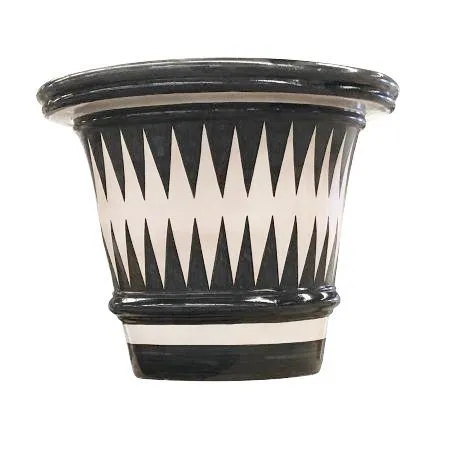 Preciosa maceta contemporánea de cerámica, prensada y pintada a mano con motivos geométricos.