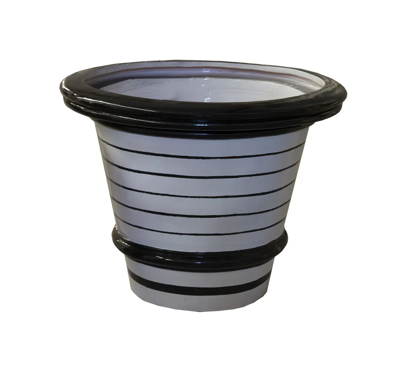 Preciosa maceta contemporánea de cerámica, prensada y pintada a mano con motivos geométricos.