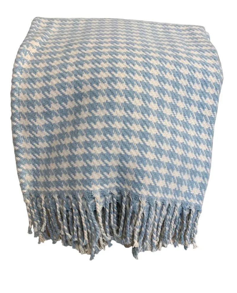 Preciosa y acogedora manta con flecos fabricada 100% en algodón en color celeste combinado con blanco.