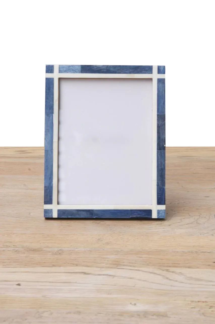 Marco de fotos fabricado en resina con rayas azules y blancas.