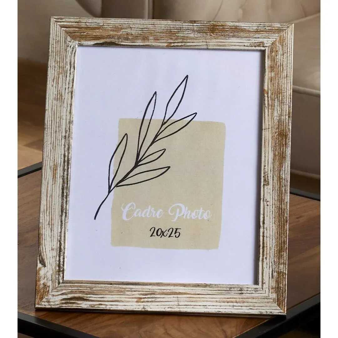 Marco de foto fabricado con imitación a madera color blanco decapado. Disponible en dos tamaños, para fotos de 15 x 20 cm y de 20 x 25 cm.