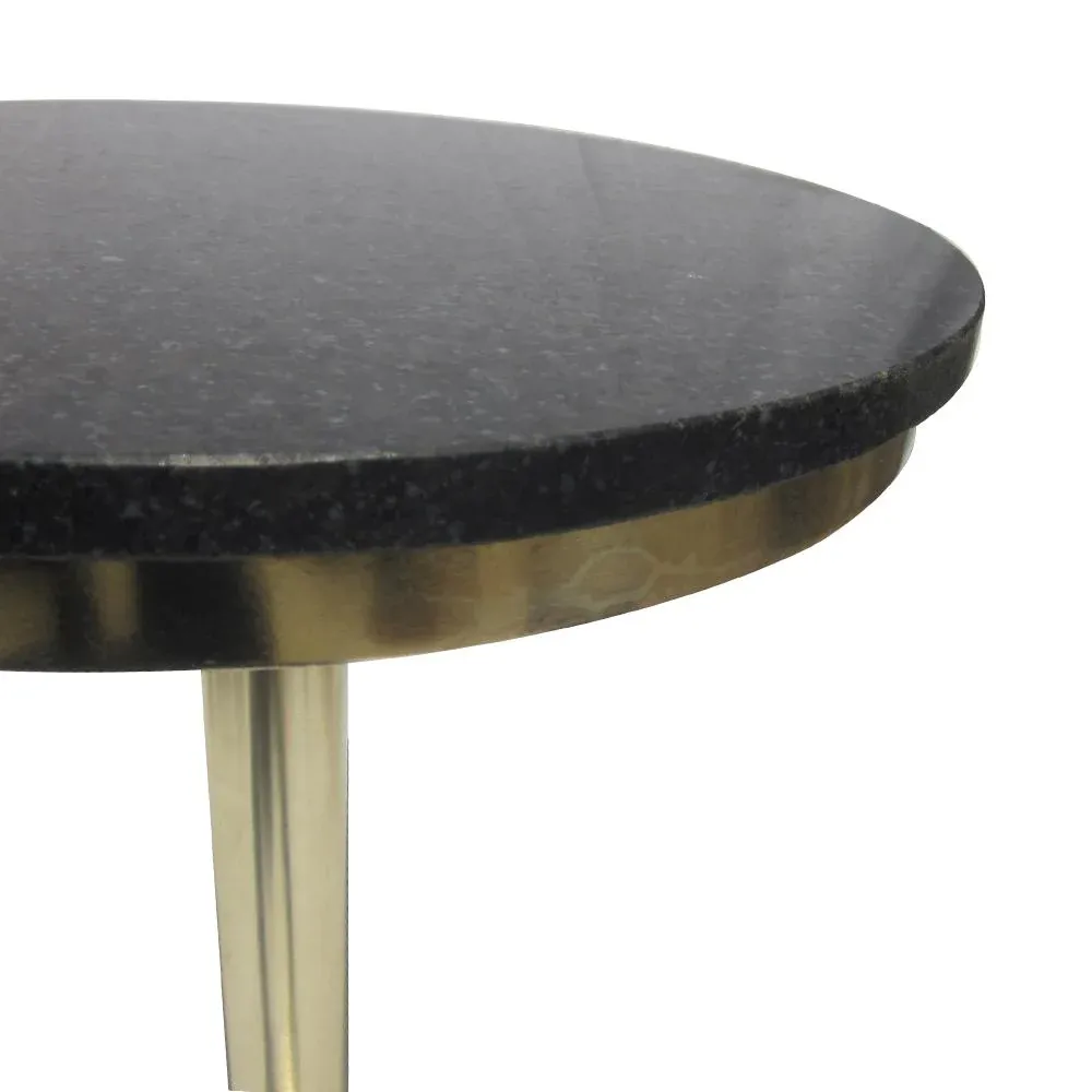 Mesa auxiliar de mármol color negro con pie de hierro color dorado.