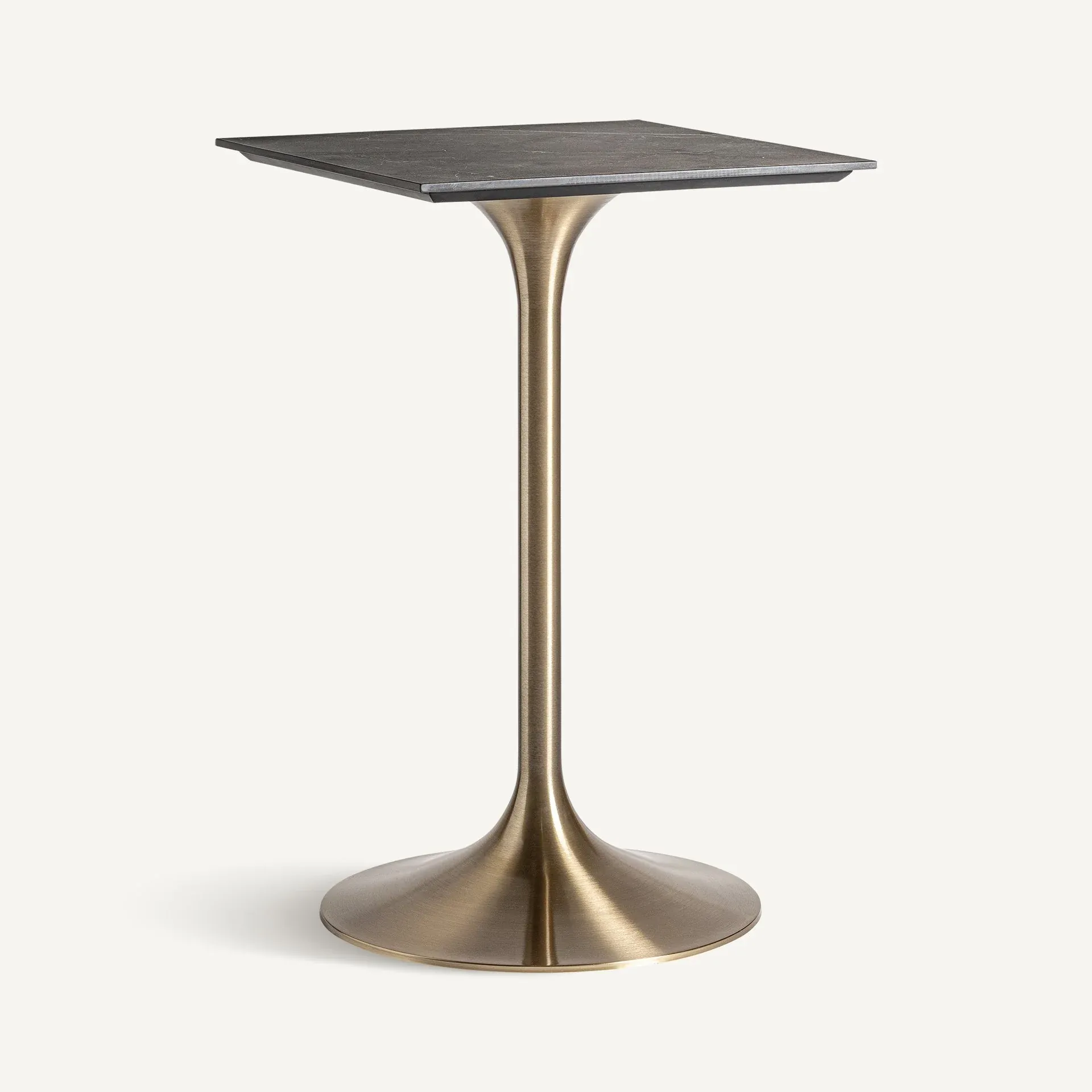 Mesa auxiliar de estilo art deco, fabricado en acero en color oro, combinado con porcelánico en color negro. Producto desmontable.
