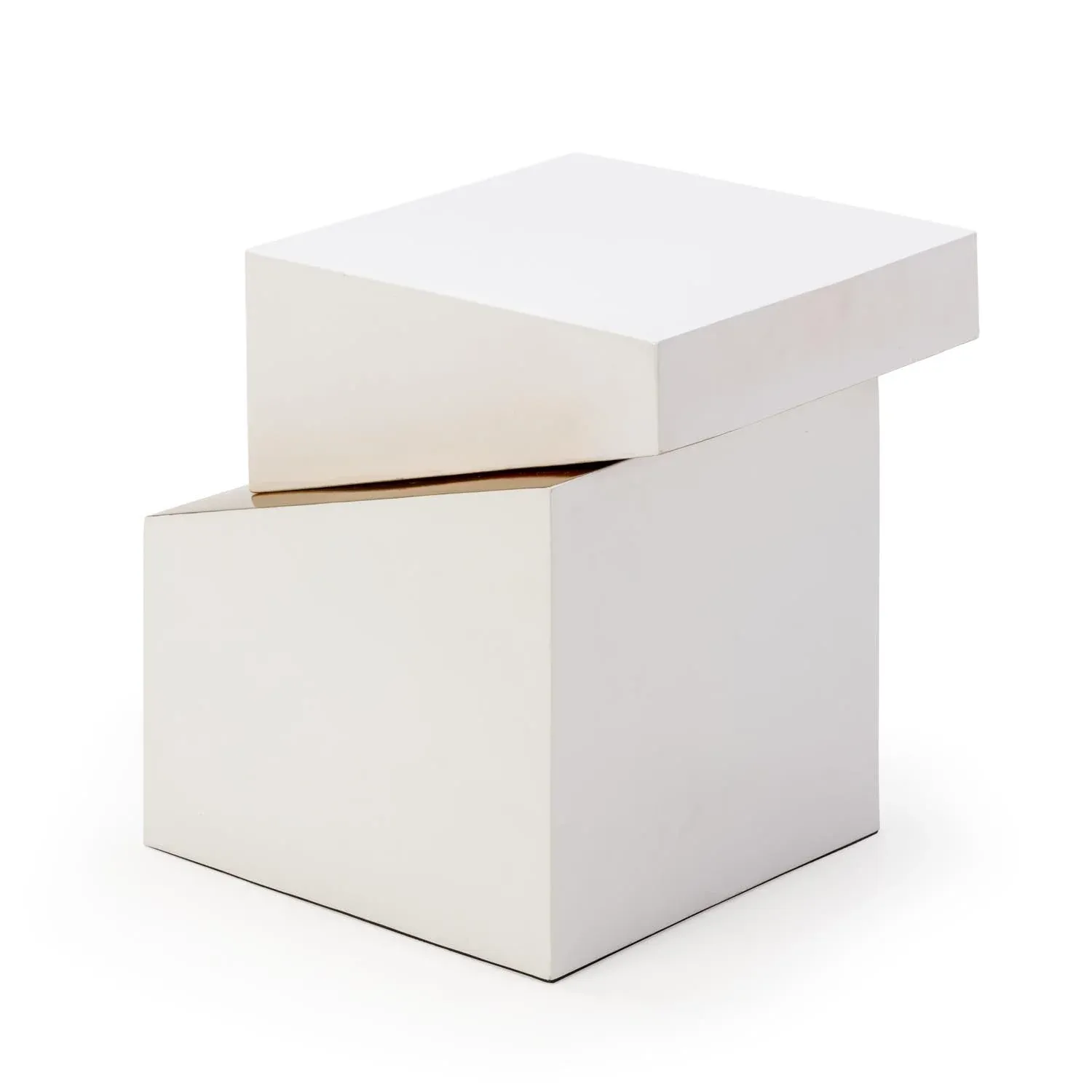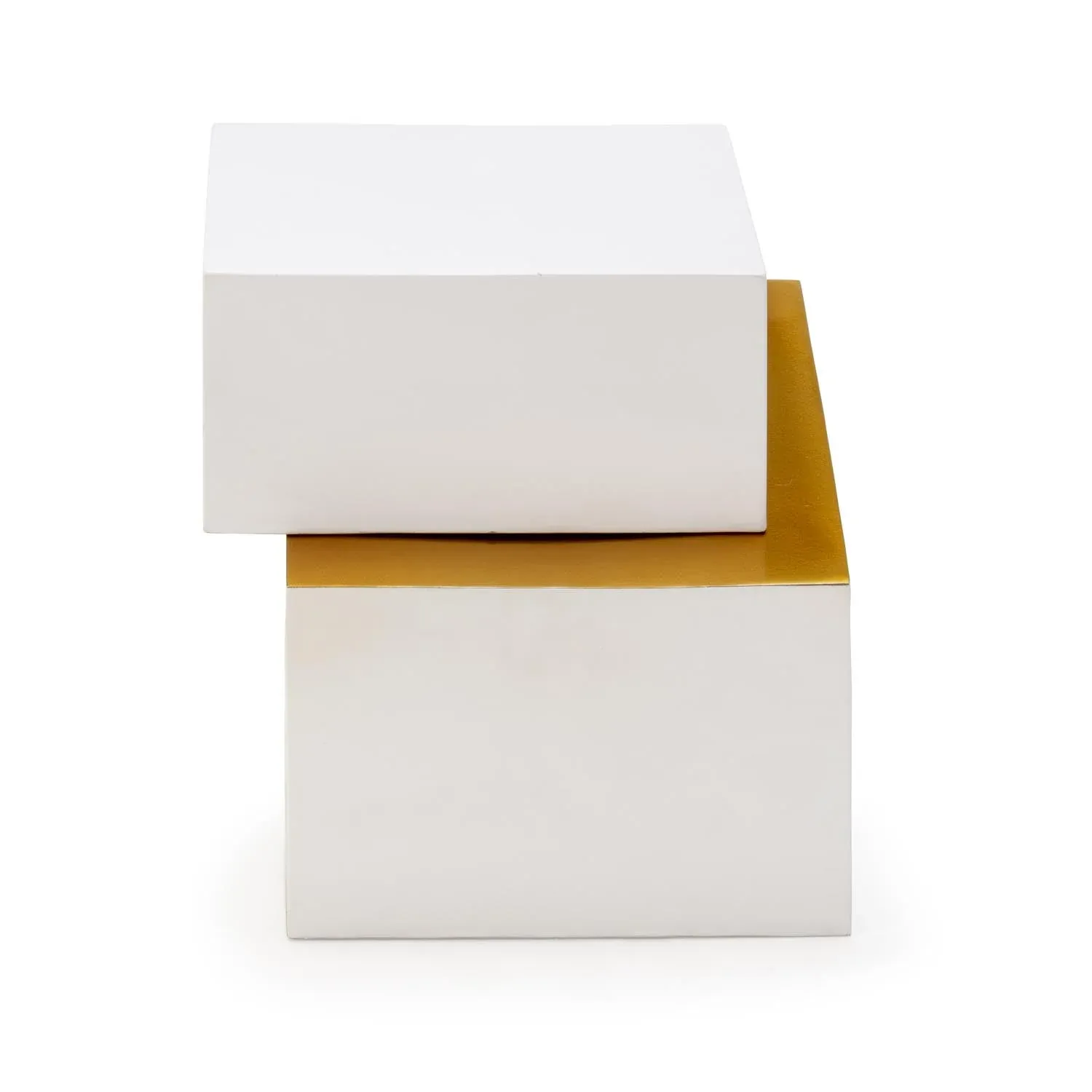 Mesa auxiliar cuadrada con un diseño original fabricada en metal color blanco y dorado.
