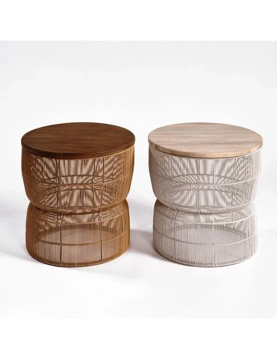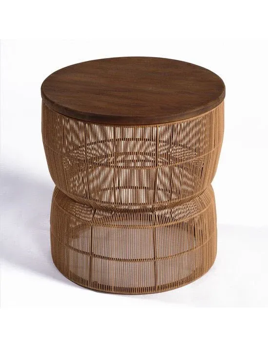 Mesa auxiliar con estructura base en cuerda sintética en color piedra o natural y sobre en madera de teca blanqueada o natural.