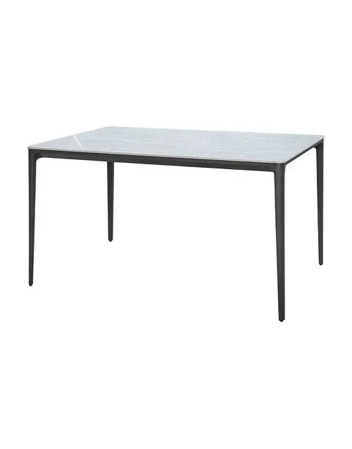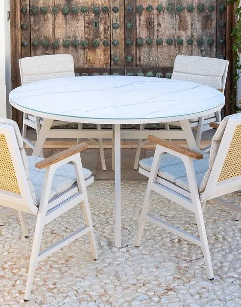 Mesa auxiliar de exterior fabricada en fibra sintética en color marrón con detalles en aluminio.