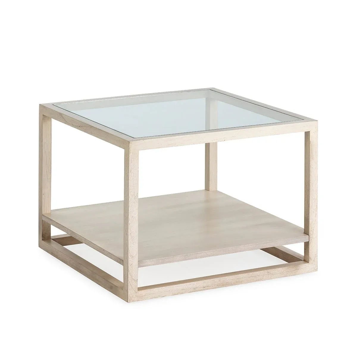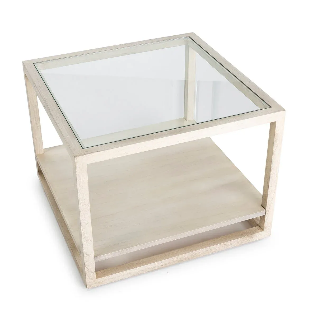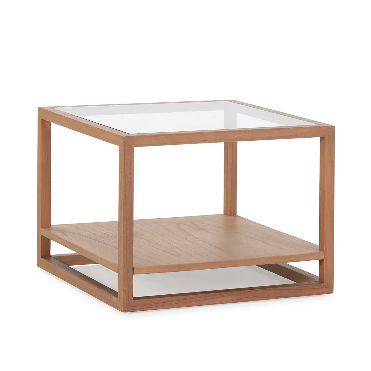 Mesa auxiliar cuadrada con tapa de cristal y estructura de patas en madera.