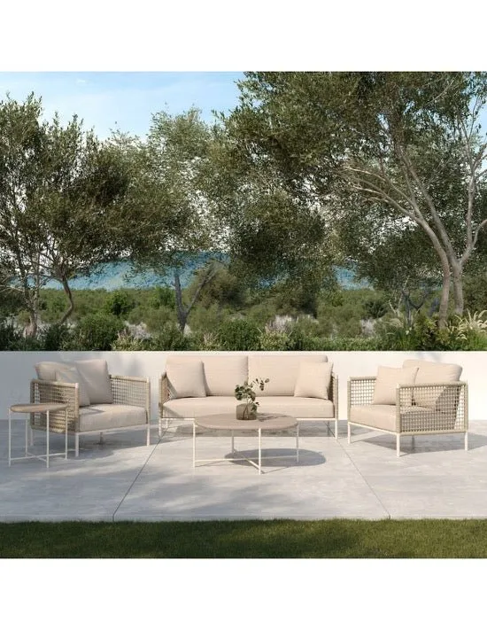 Mesa de centro para exterior con sobre de madera de teca envejecida y estructura sencilla de aluminio blanco. Mesa de centro para jardín o porche ideal para tu zona de relax o descanso al aire libre con estilo moderno y minimalista.