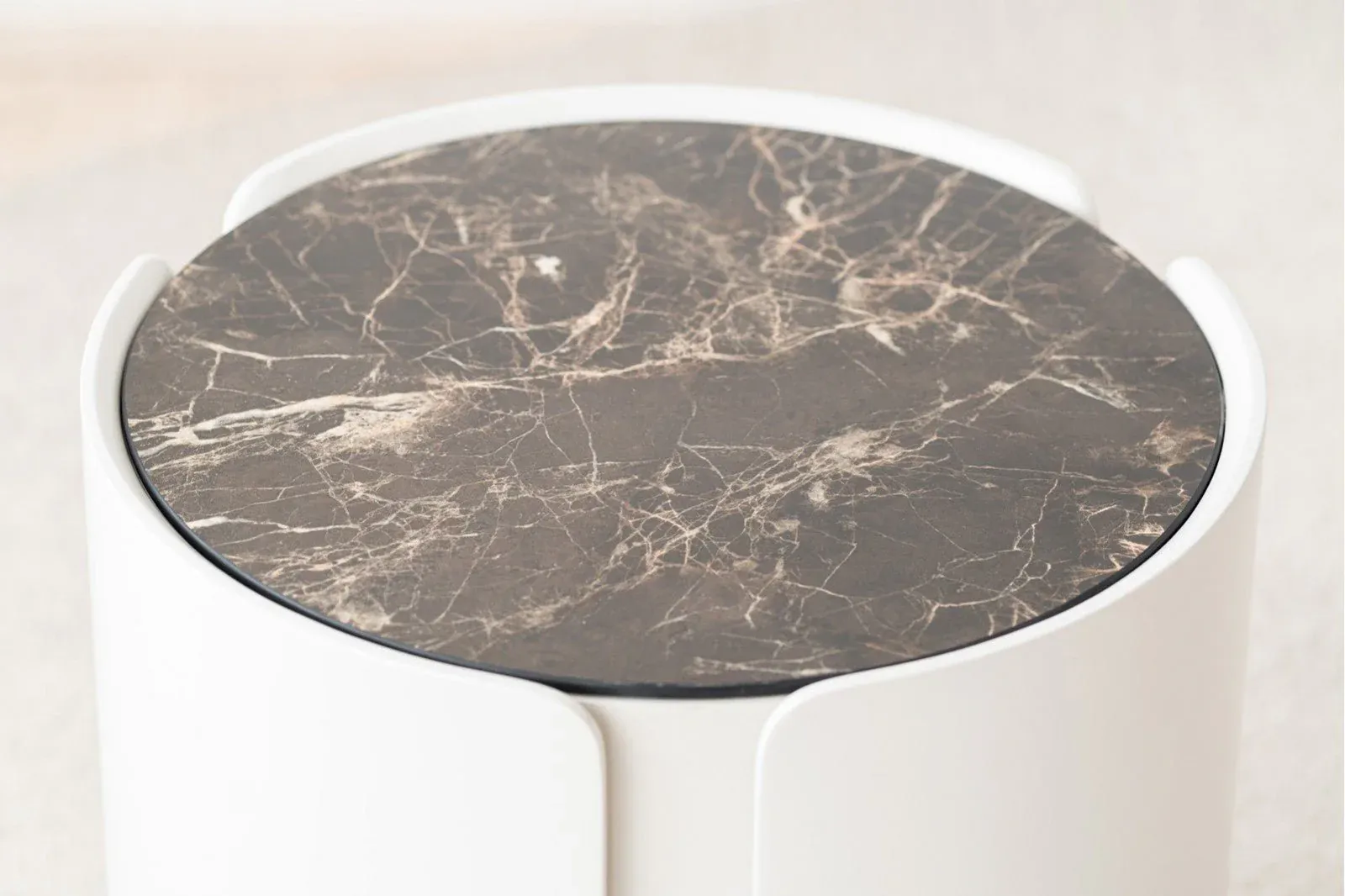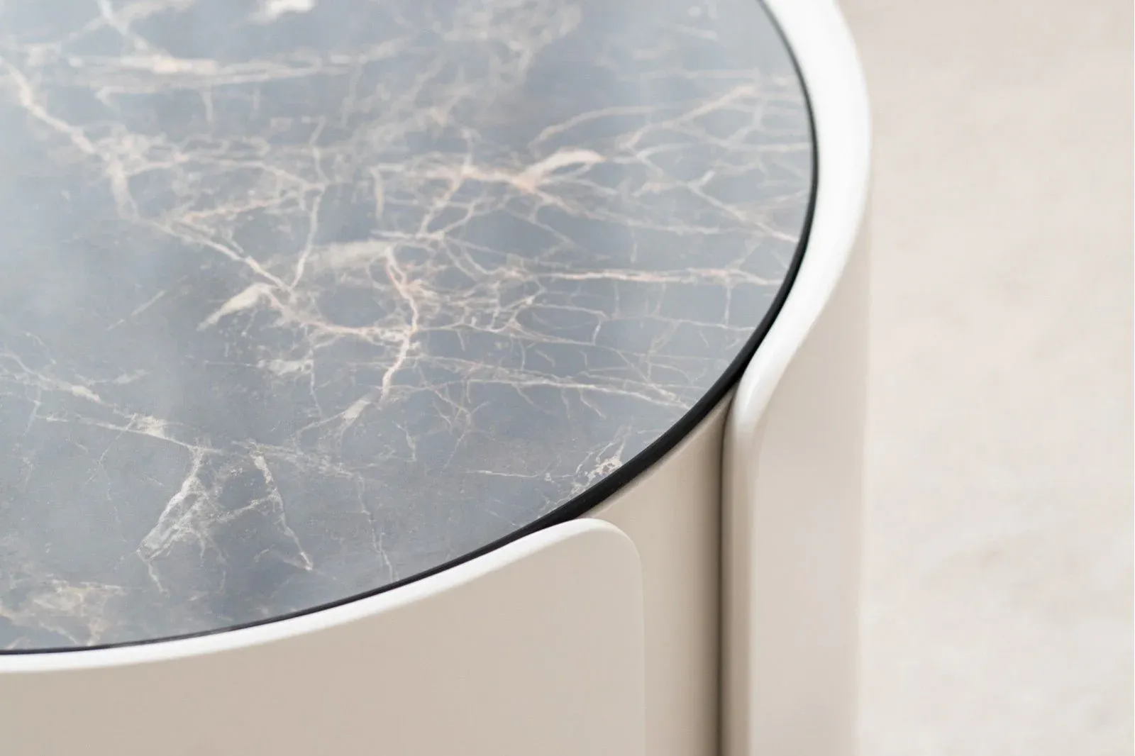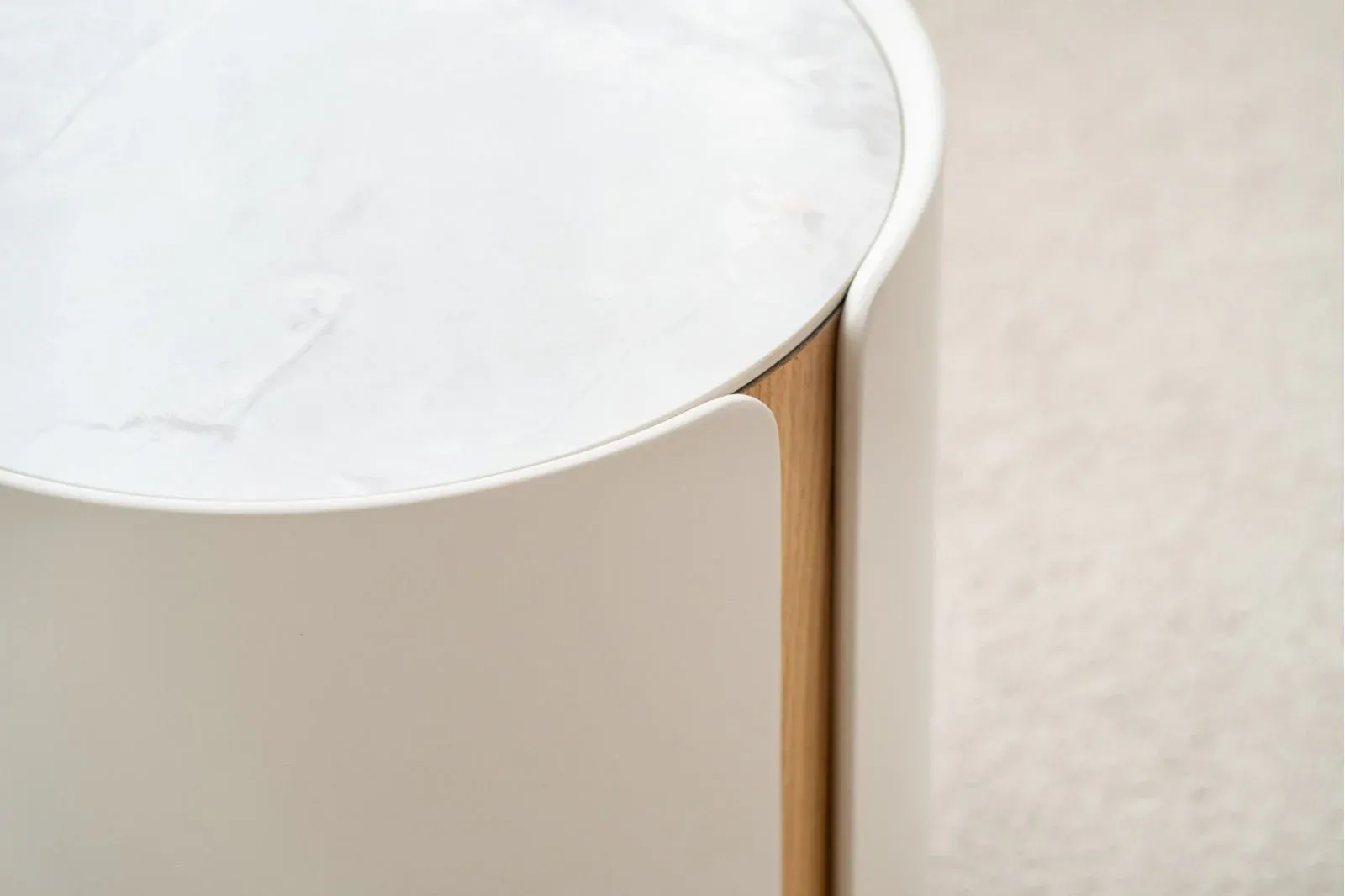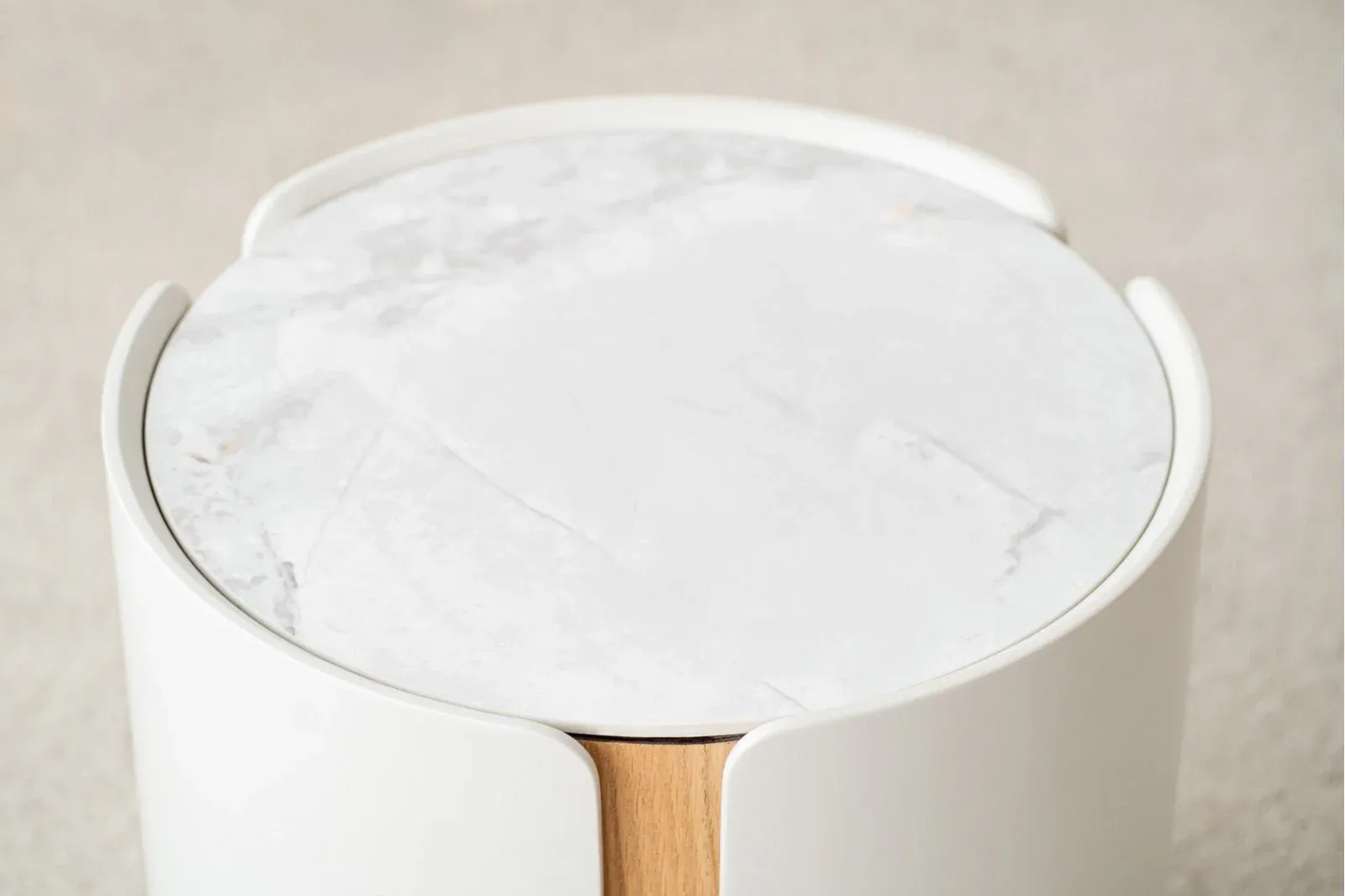 Mesa auxiliar cilíndrica con una capa envolvente de tres piezas en lacado gris arena mate de cantos redondeados que se superpone a una base cilíndrica en roble natural, la tapa de la mesa es de cerámico en tonos blancos, grises y detalles en ocres.