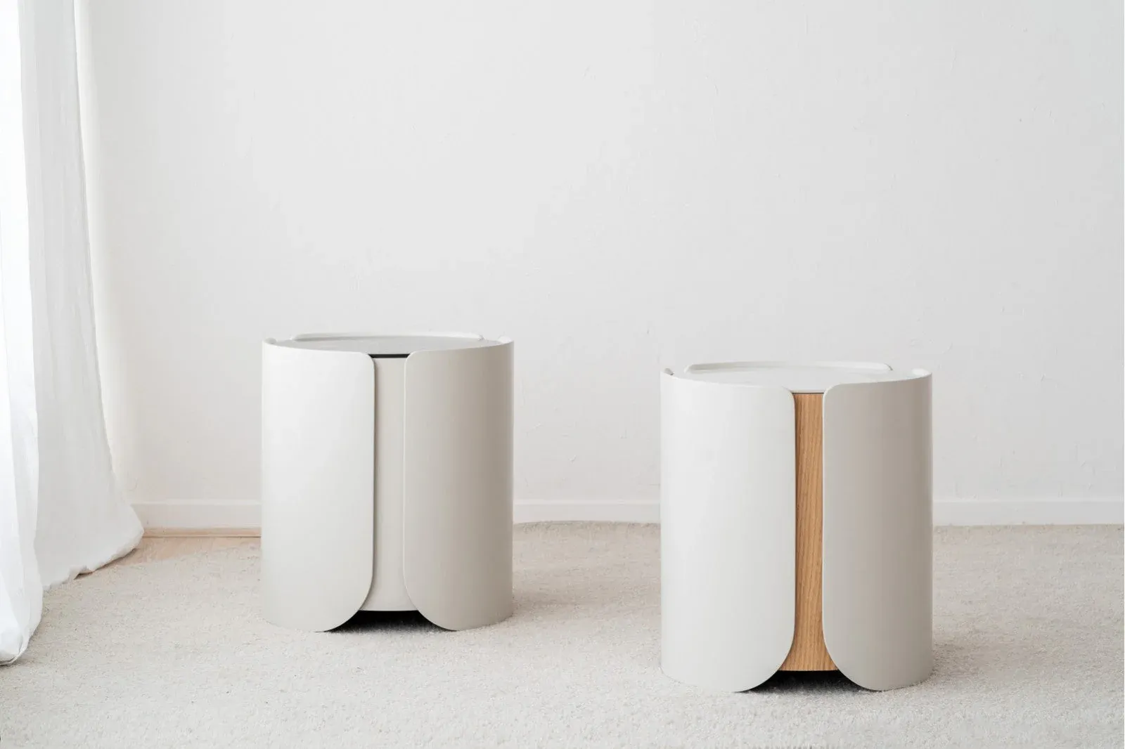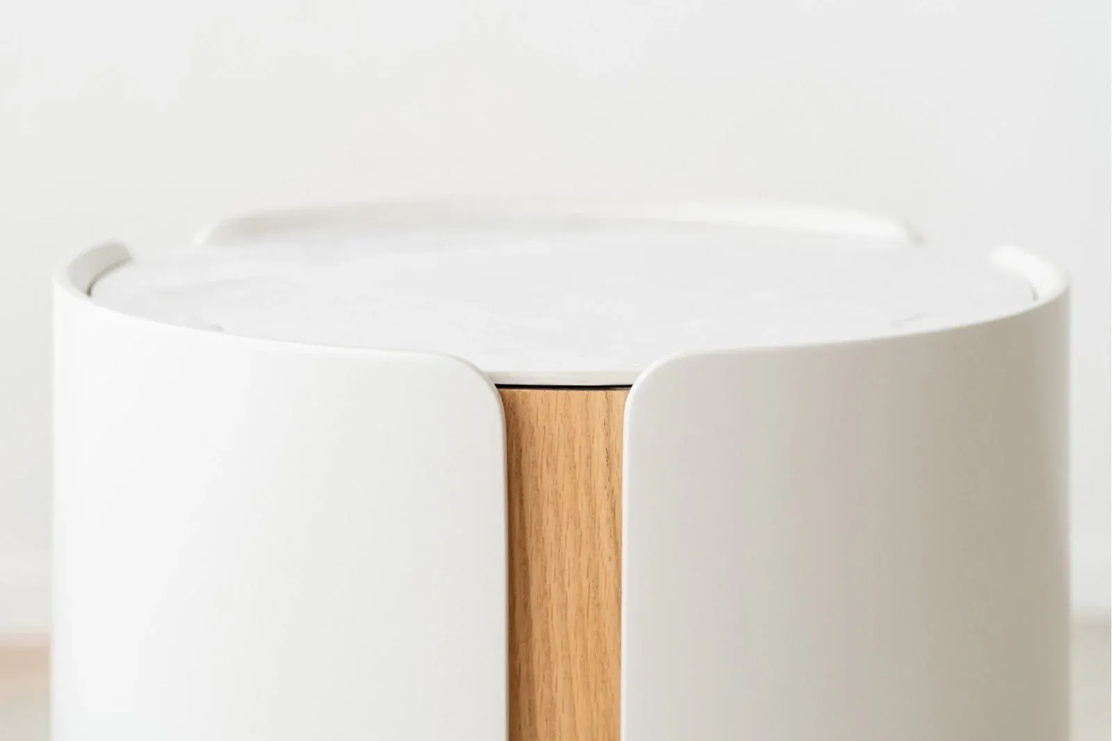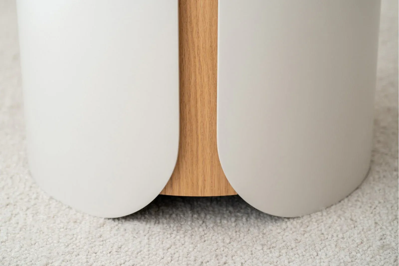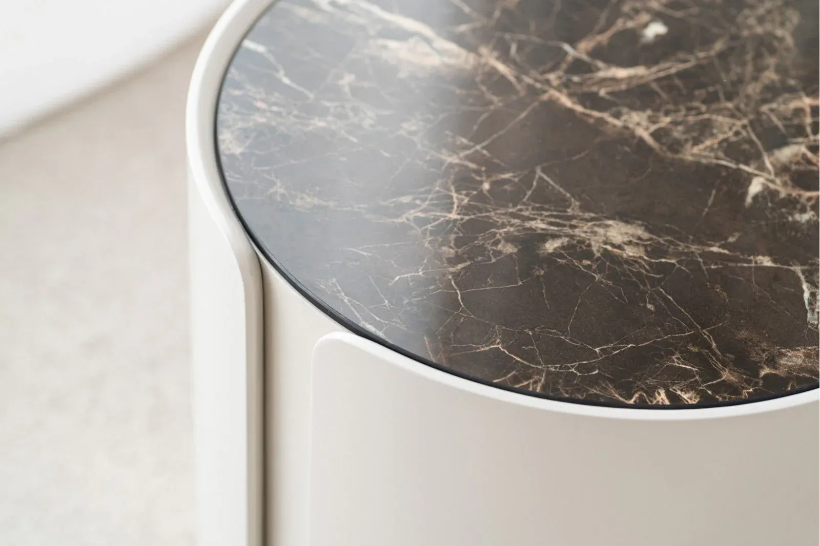 Mesa auxiliar cilíndrica con una capa envolvente de tres piezas en lacado gris arena mate de cantos redondeados que se superpone a una base cilíndrica en roble natural, la tapa de la mesa es de cerámico en tonos blancos, grises y detalles en ocres.