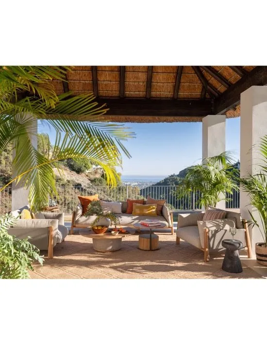 Mesa auxiliar redonda con base maciza de madera de teca y pie color negro. Un diseño minimalista y práctico.