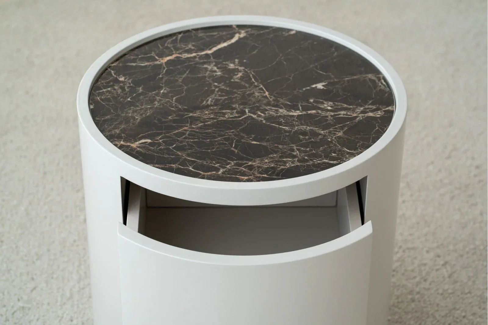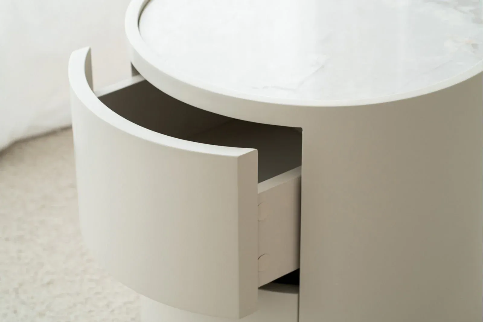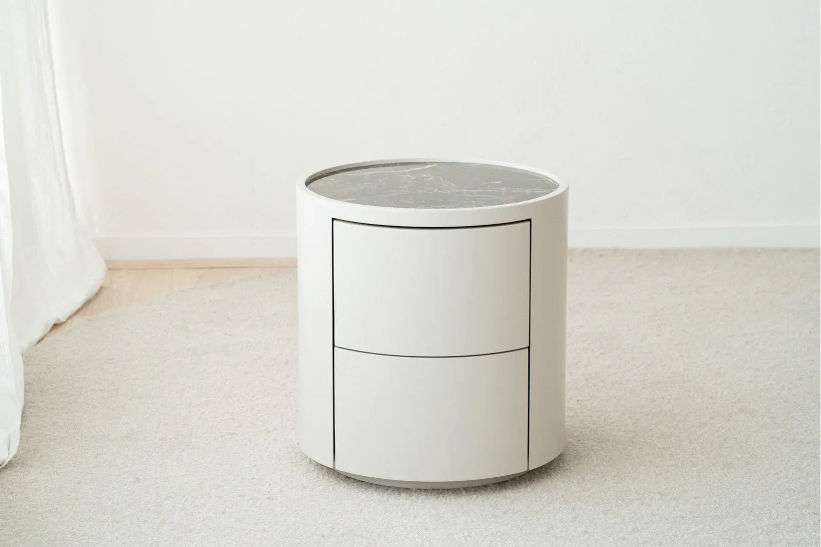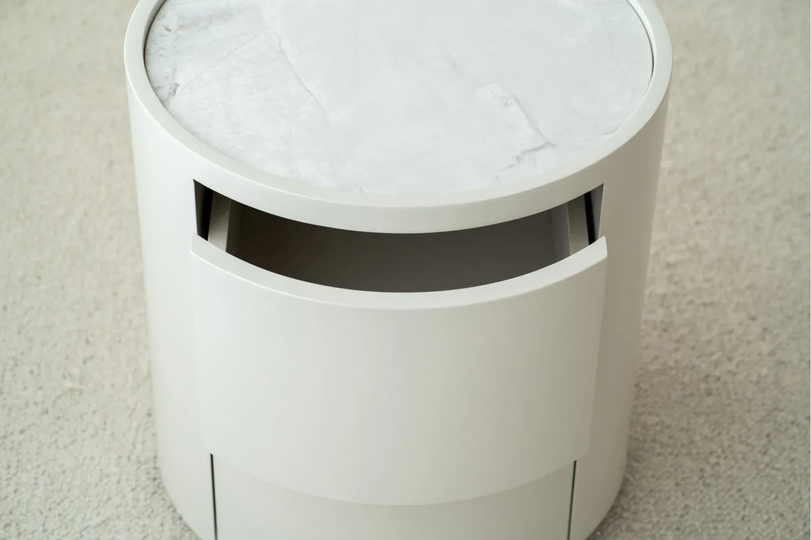 Mesa auxiliar de líneas redondeadas realizada en tablero DM lacado en un cálido gris arena acabado mate que combina a la perfección con los tonos blancos y grises o marrones y beige del material cerámico empleado para el tablero, cuenta con dos prácticos cajones y es una mesa perfecta para un salón, una habitación o cualquier rincón.