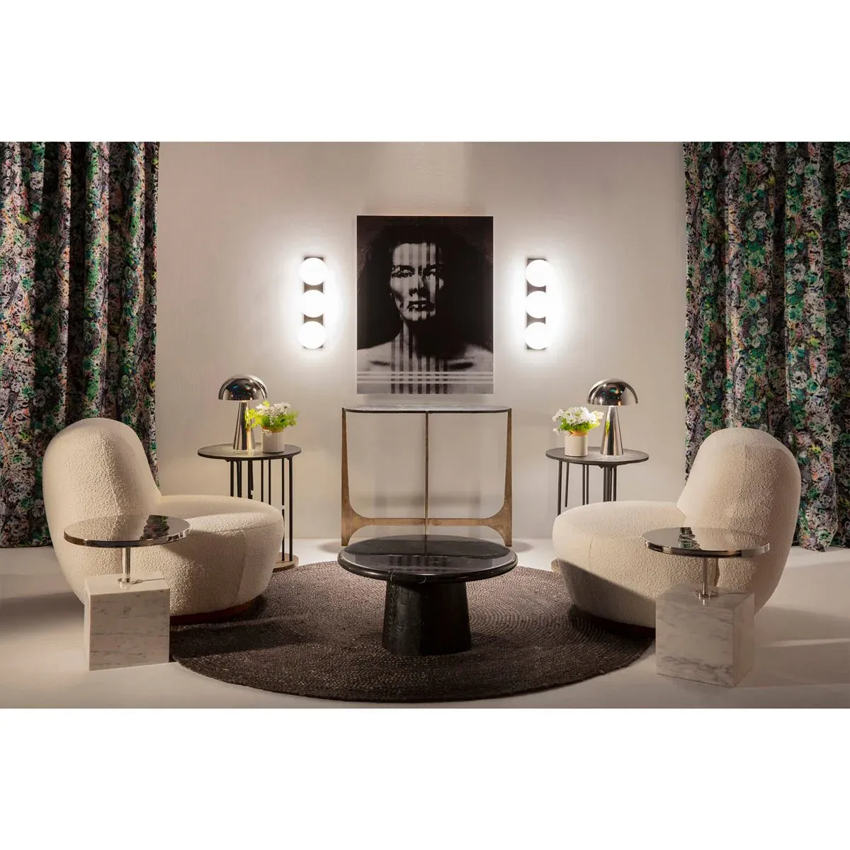 Mesa auxiliar redonda con tapa de mármol negro y estructura de patas en metal negro y base en metal dorado.