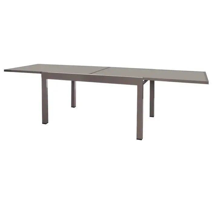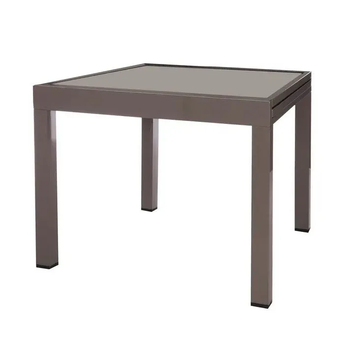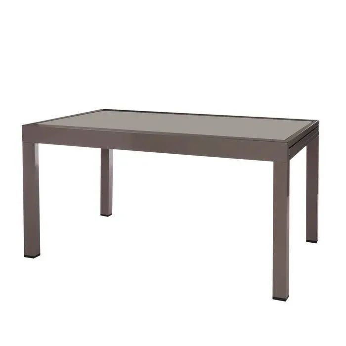 Preciosa mesa de comedor de uso exterior con tapa de cristal templado de 5 mm sobre estructura de aluminio. Disponible en 3 tamaños diferentes.