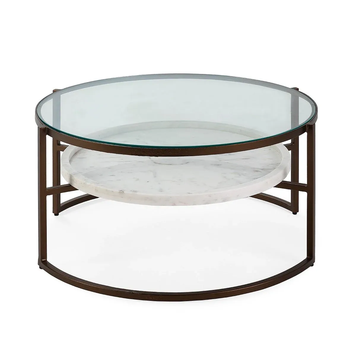 Preciosa mesa de centro fabricada en metal color bronce, mármol blanco y tapa en cristal.