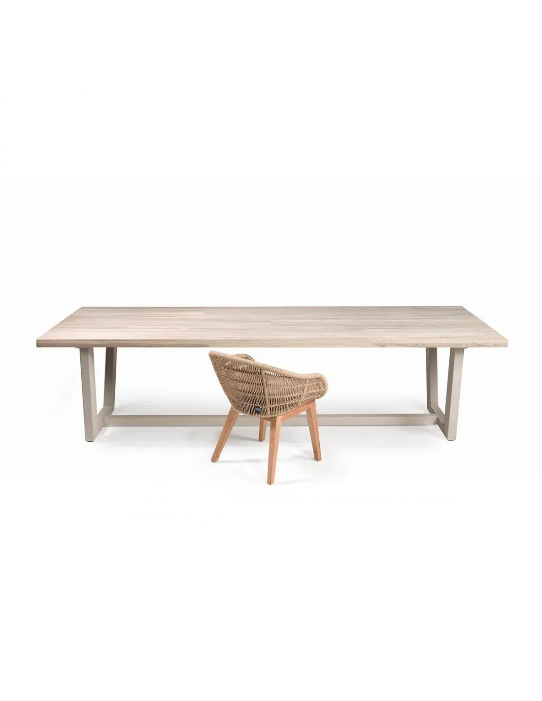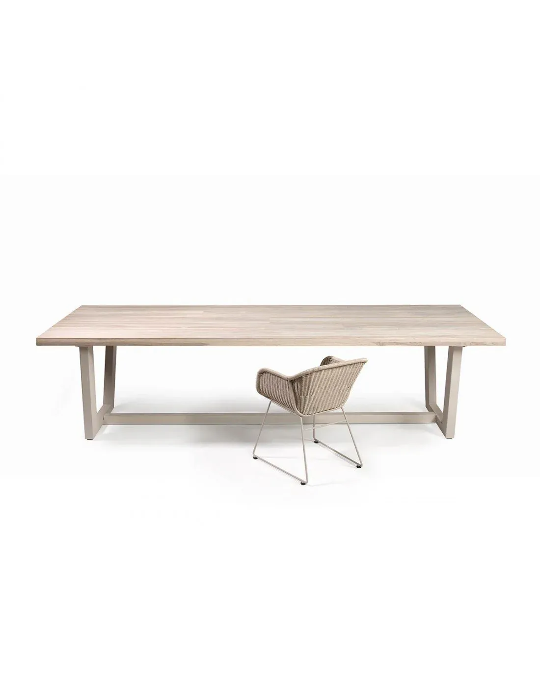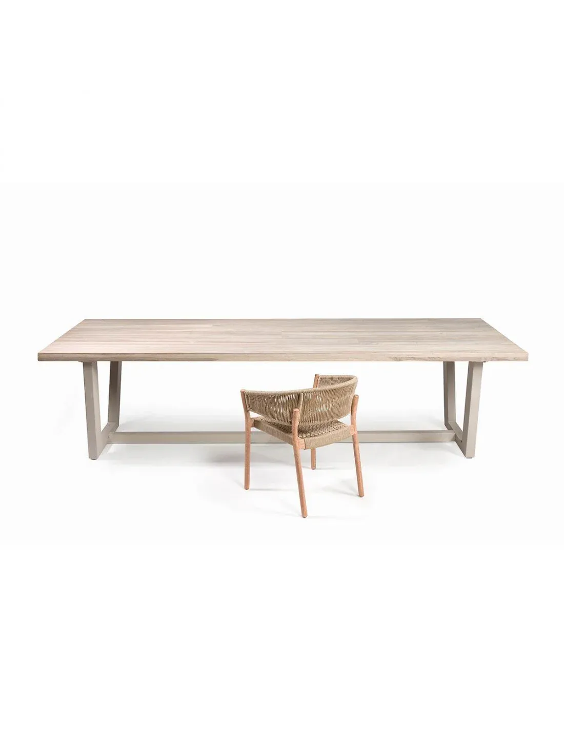 Mesa de comedor rectangular con tablero de madera de teca color stone y base de metal en color beige. Pensada para uso exterior. Cuenta con un trabesaño en la parte inferior para aportar mayor estabilidad. Crea con ella también ambientes rústicos y coloniales.