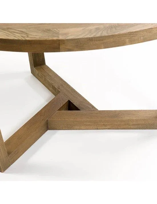 Mesa redonda de comedor con estructura completa de roble en color natural. Las patas presentan una estructura geométrica entrelazada dejando un pequeño triángulo en el interior y espacio para la utilización cómoda de sillas o sillones.