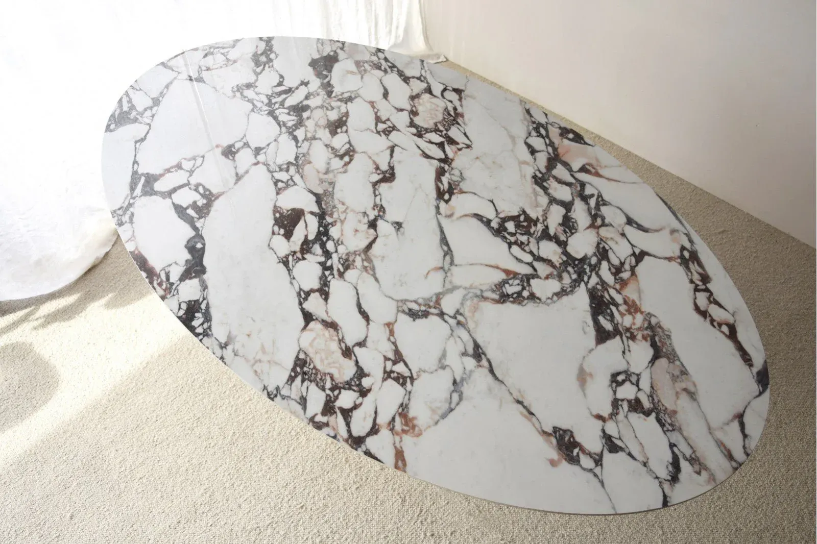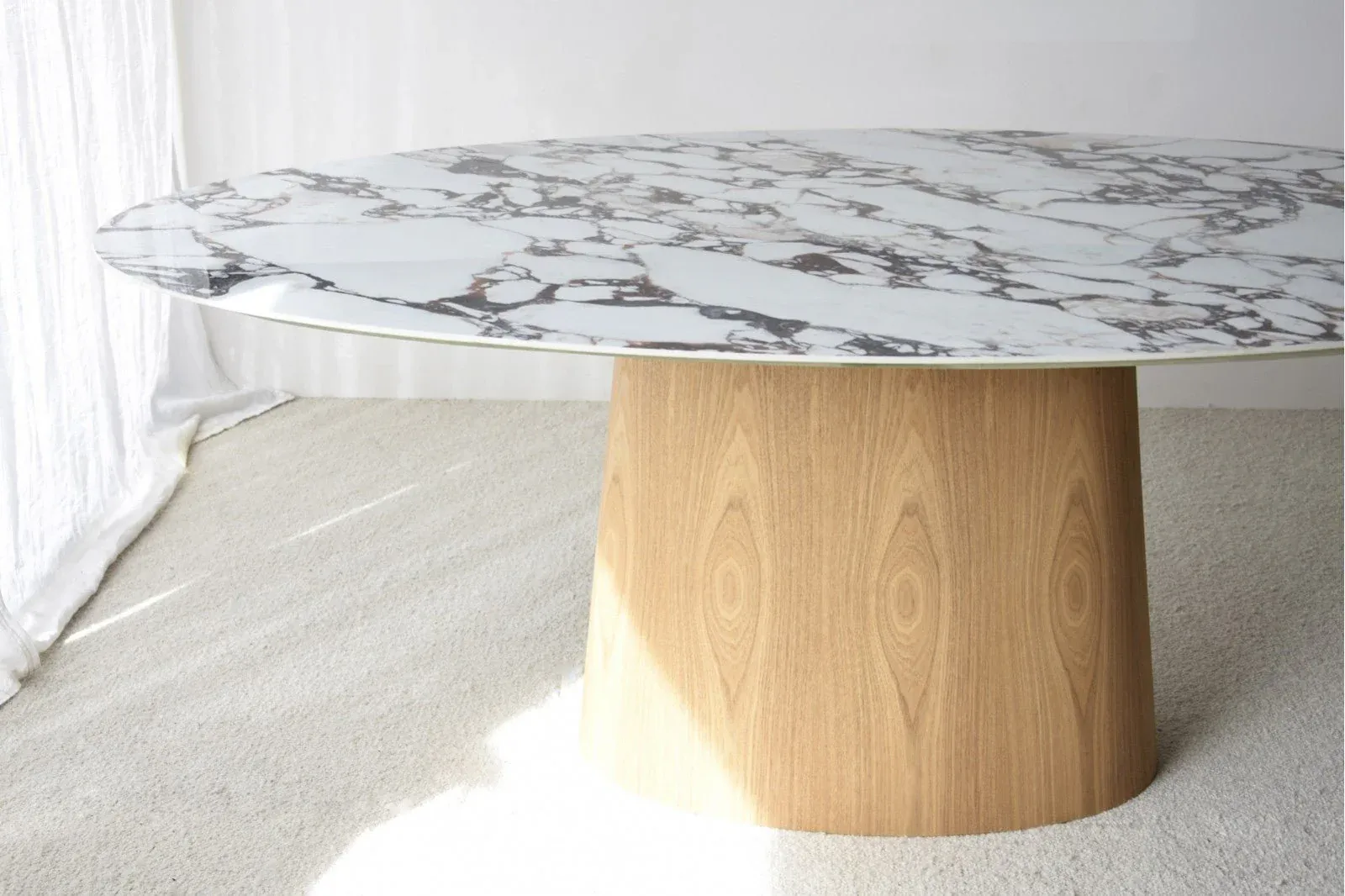 Mesa comedor oval con la parte superior en material cerámico, acabado mármol con un dibujo en distintas tonalidades marrón, violeta, rojo, sobre fondo en blanco acabado en brillo. La base de la mesa es de madera de fresno.