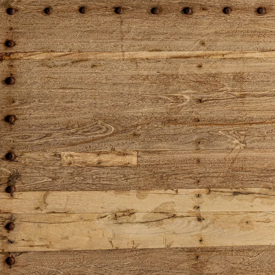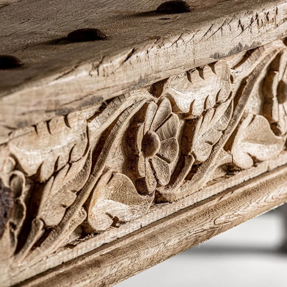 Mesa de comedor Mengi fabricada artesanalmente en madera de mango en color natural envejecido de estilo étnico.