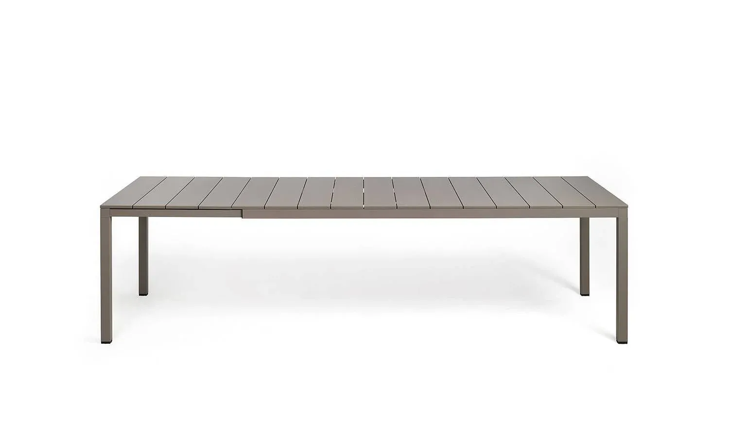 Mesa de comedor extensible, perfecta tanto para exteriores como para interiores, con detalles arquitecturales y destacada personalidad. Superficie de duelas de resina DurelTop tratada anti UV y tintada en bloque y estructura de aluminio barnizado. Sólida y funcional, está disponible en dos medidas.