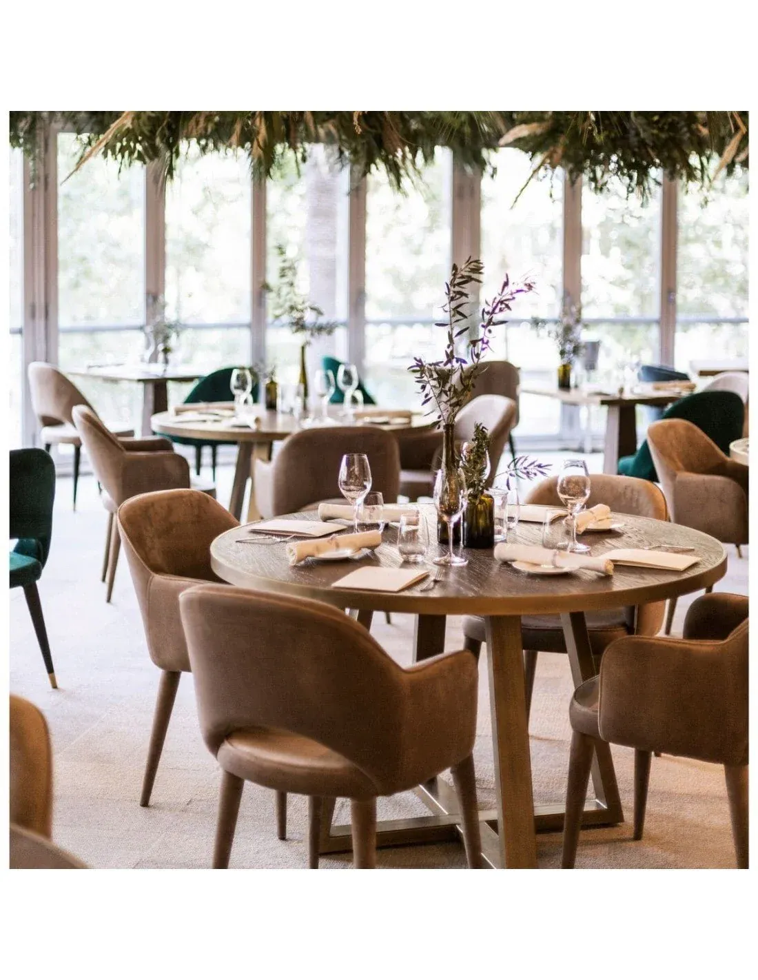 Una mesa con encanto. La mesa de comedor de madera de roble y metal de color oro rosado, con patas en forma de aspas.