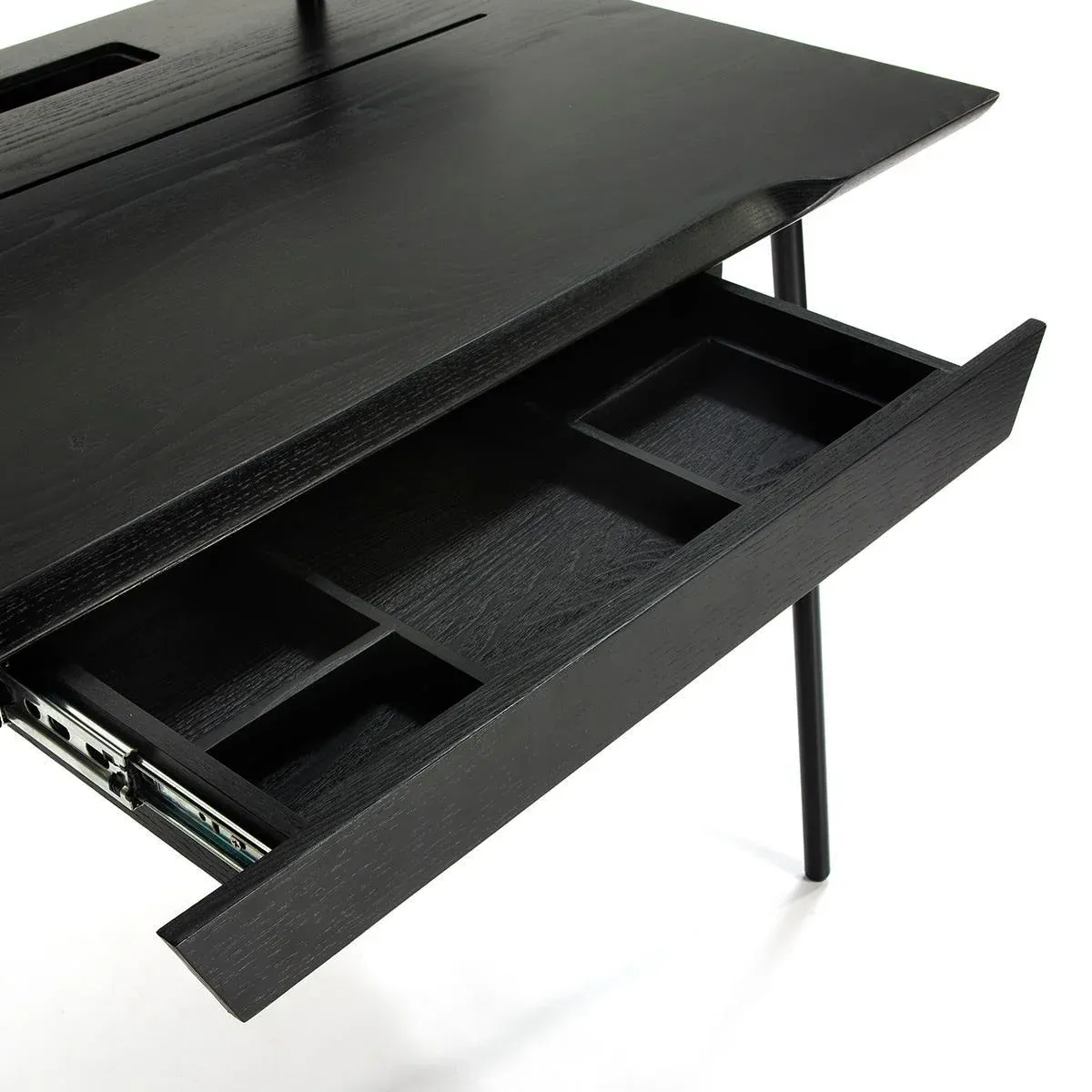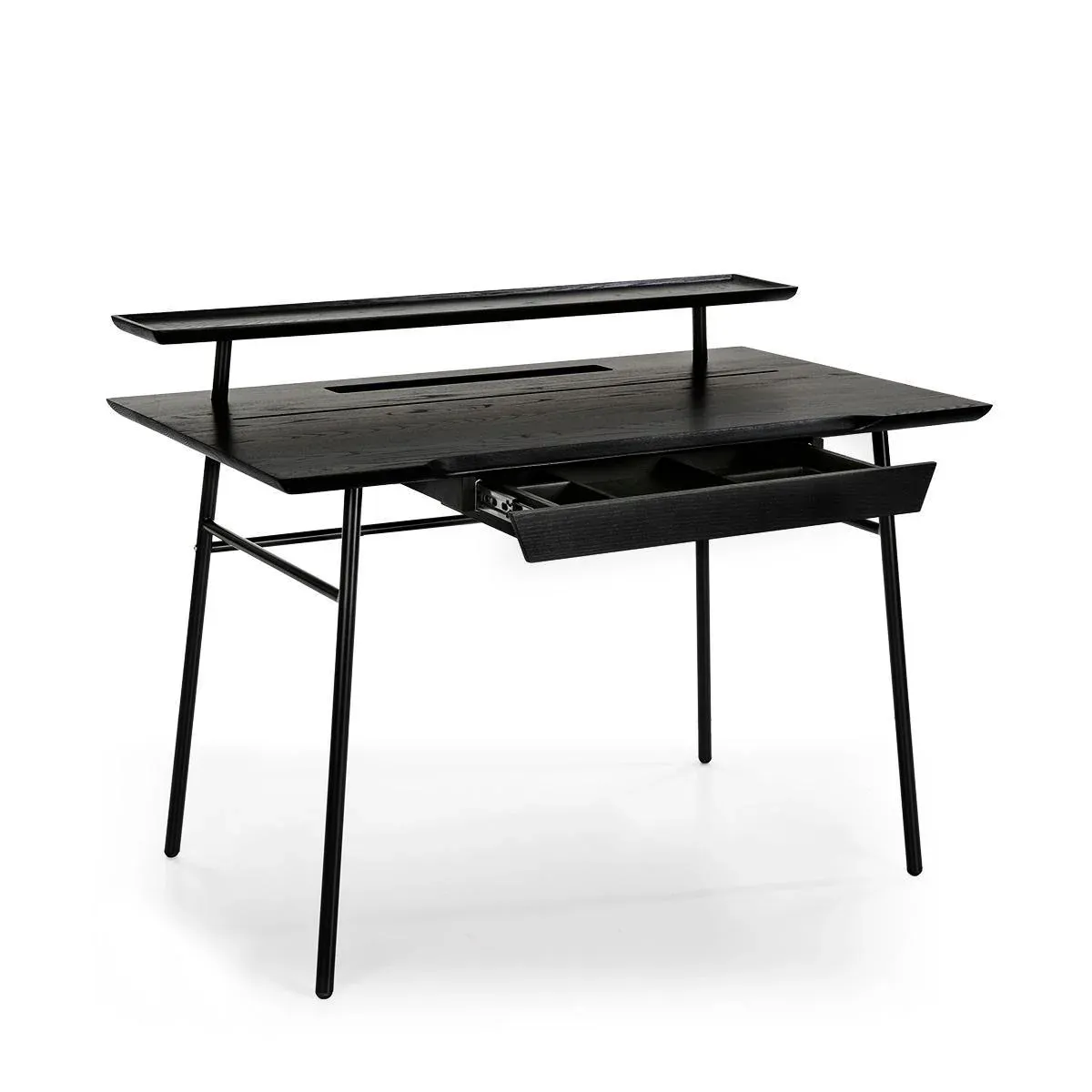 Mesa de estudio de madera en color negro sobre estructura metálica de color negro.