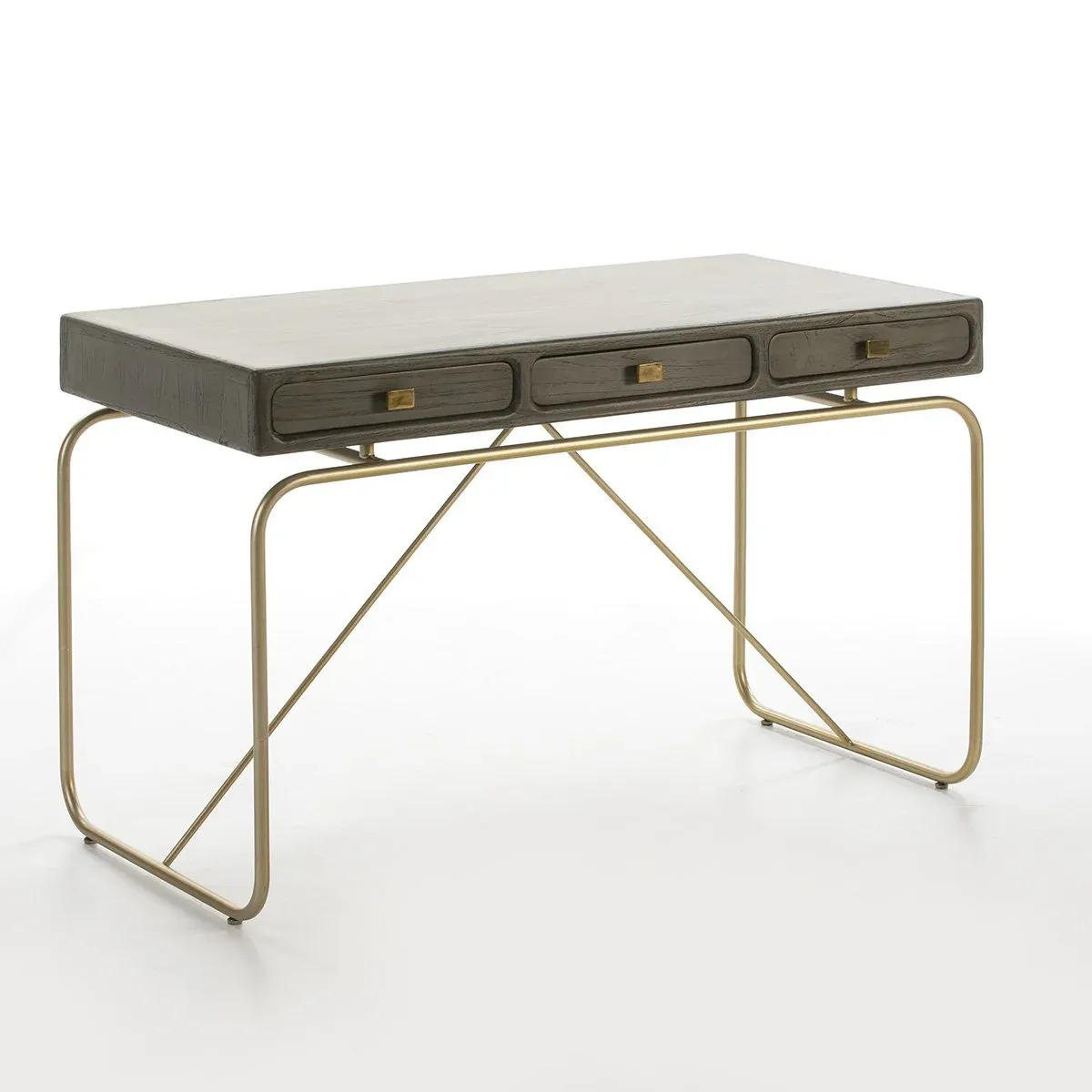 Mesa de estudio de madera de olmo en color blanco con patas y detalles metálicos de color dorado.