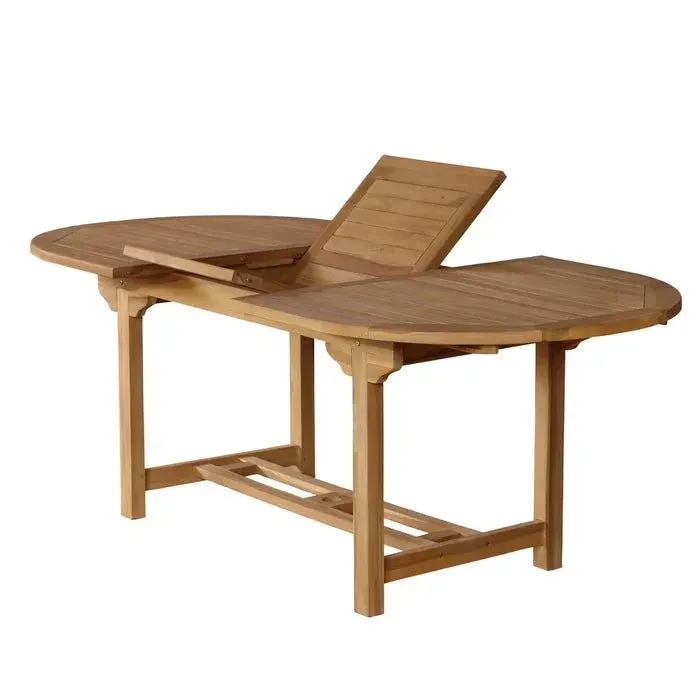 Preciosa mesa extensible para uso de exterior fabricada en madera de teca en color natural. Disponible en forma rectangular y ovalada.