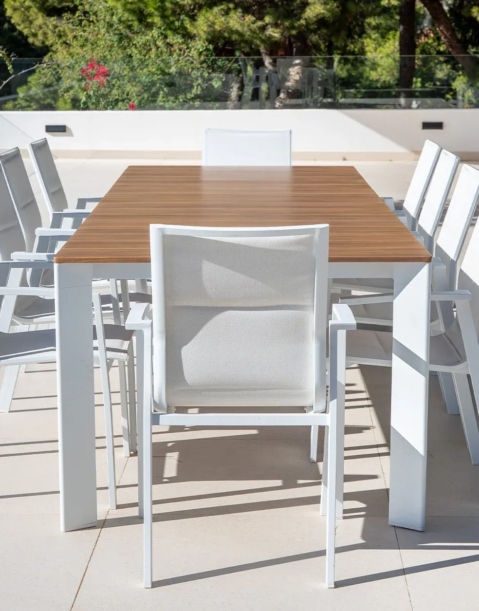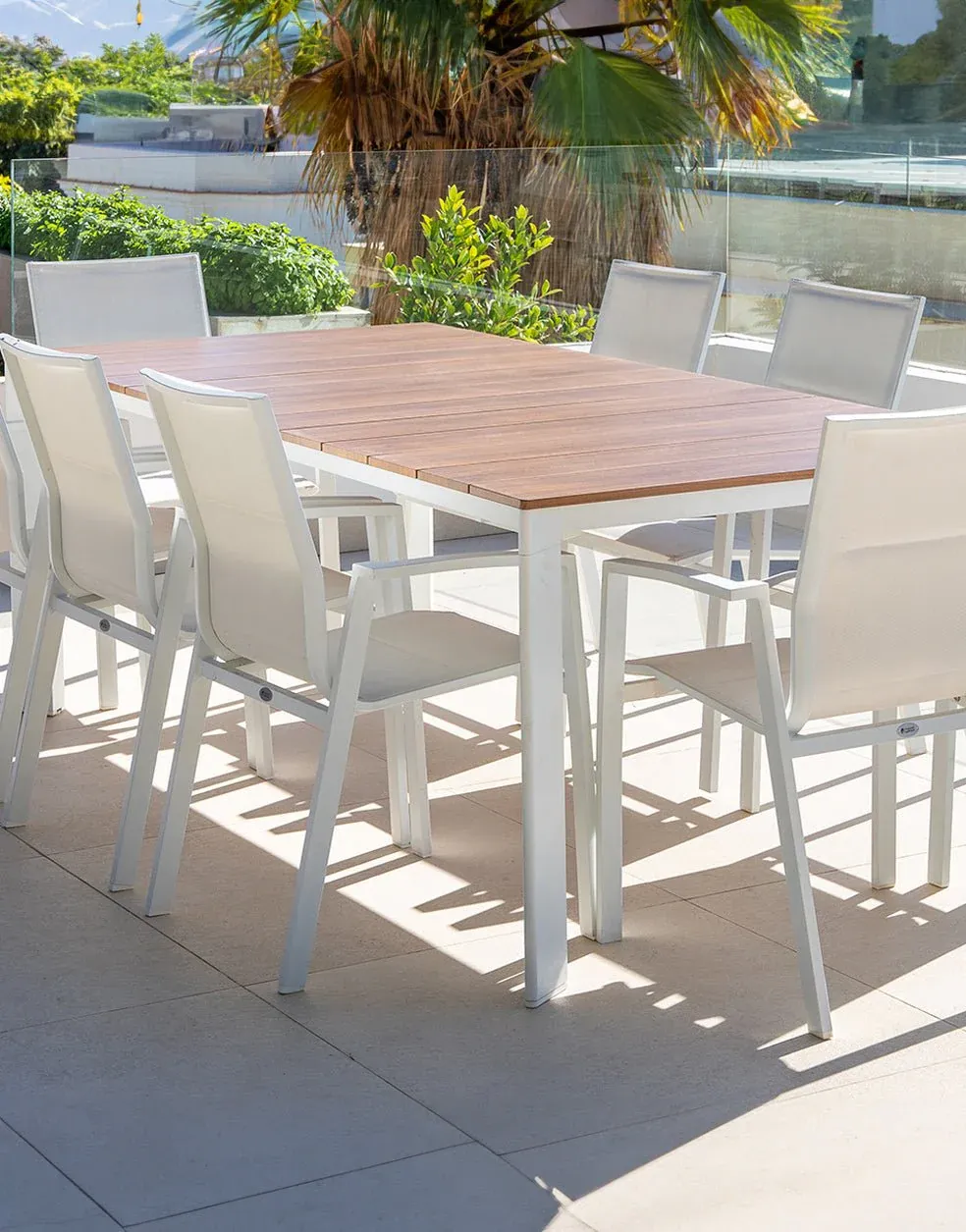 Mesa con extensión telescópica de aluminio blanco, tablero cerámico imitación a madera.