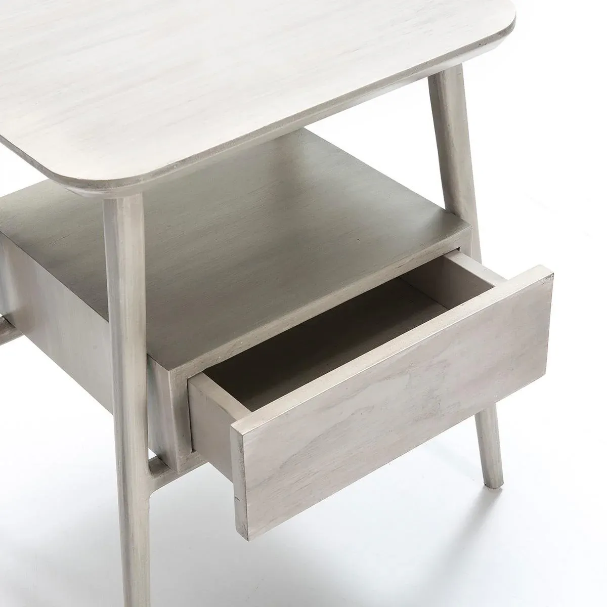 Original mesita de noche de madera procedente de bosques sostenibles en color gris velado.