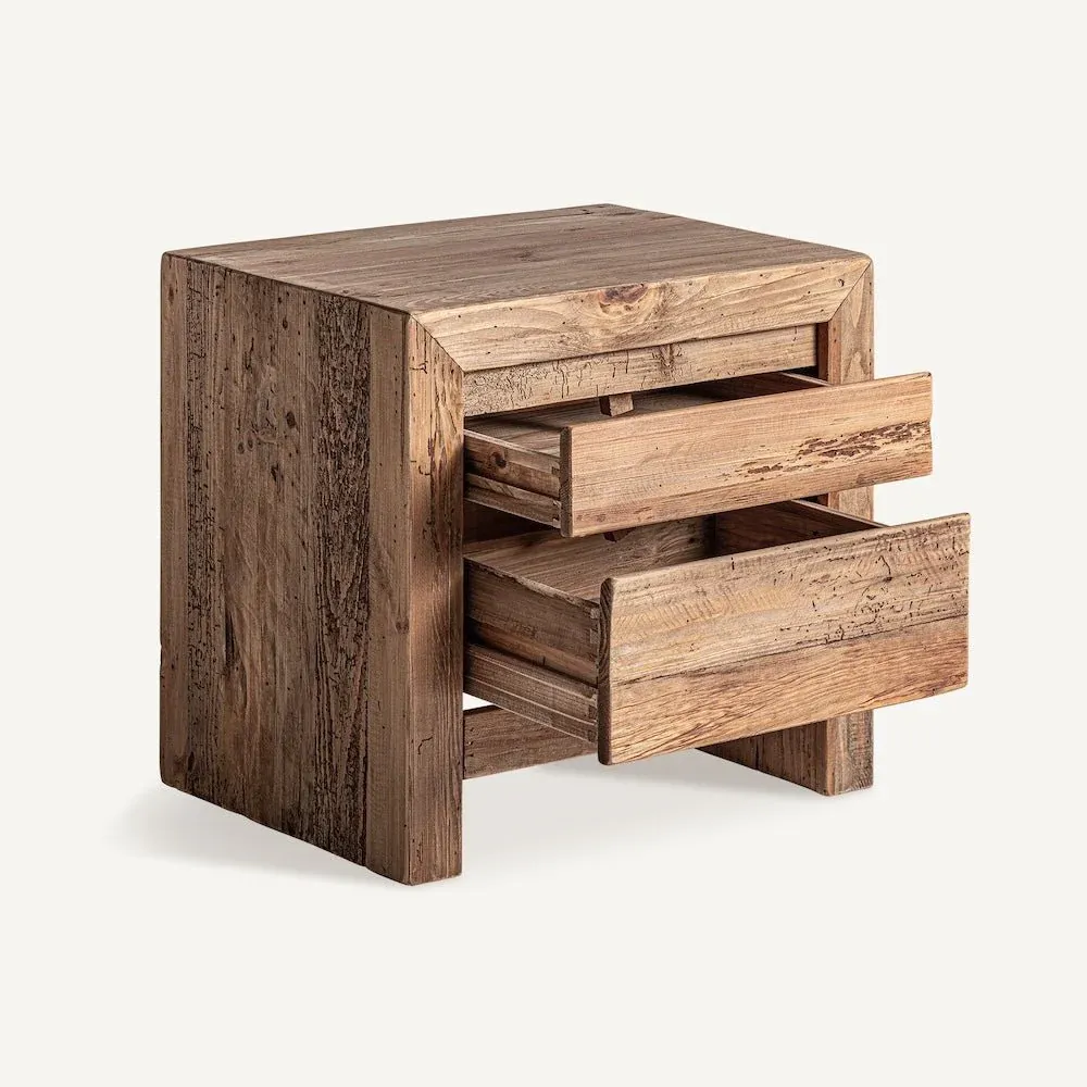 Mesita de noche de estilo rústico, fabricado en madera de pino reciclado en color marrón con acabado envejecido.