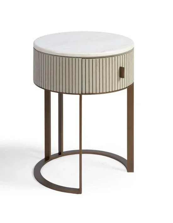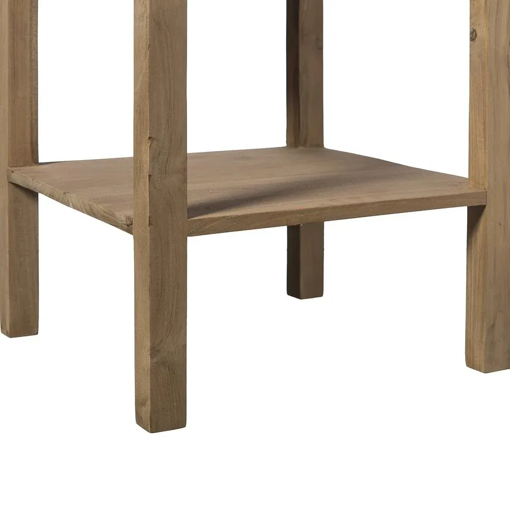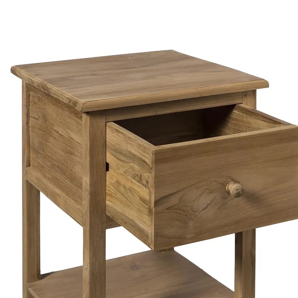 Mesita de noche de madera de teca en color natural. Cuenta con un pequeño cajón y una balda en la parte inferior.