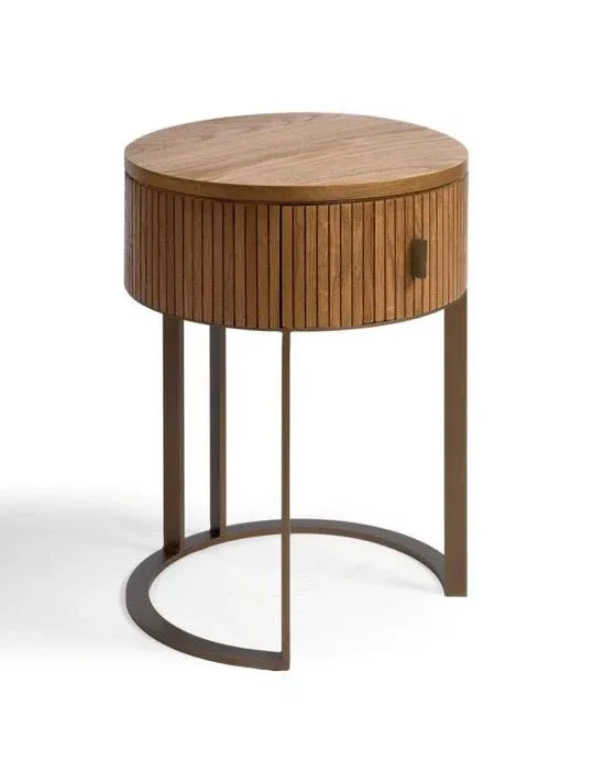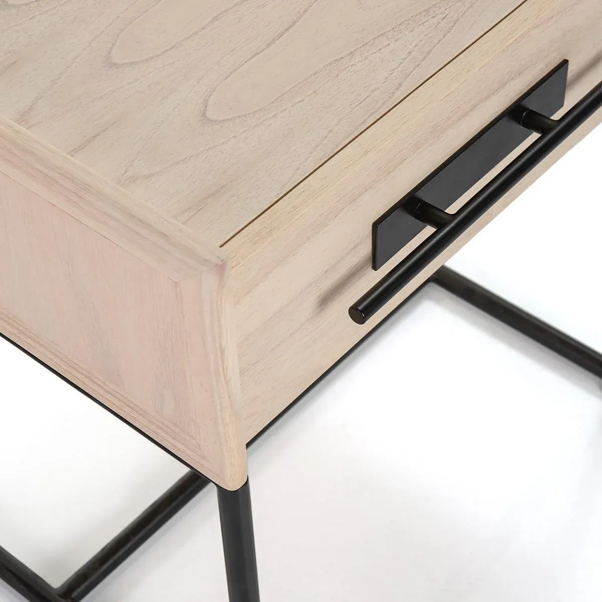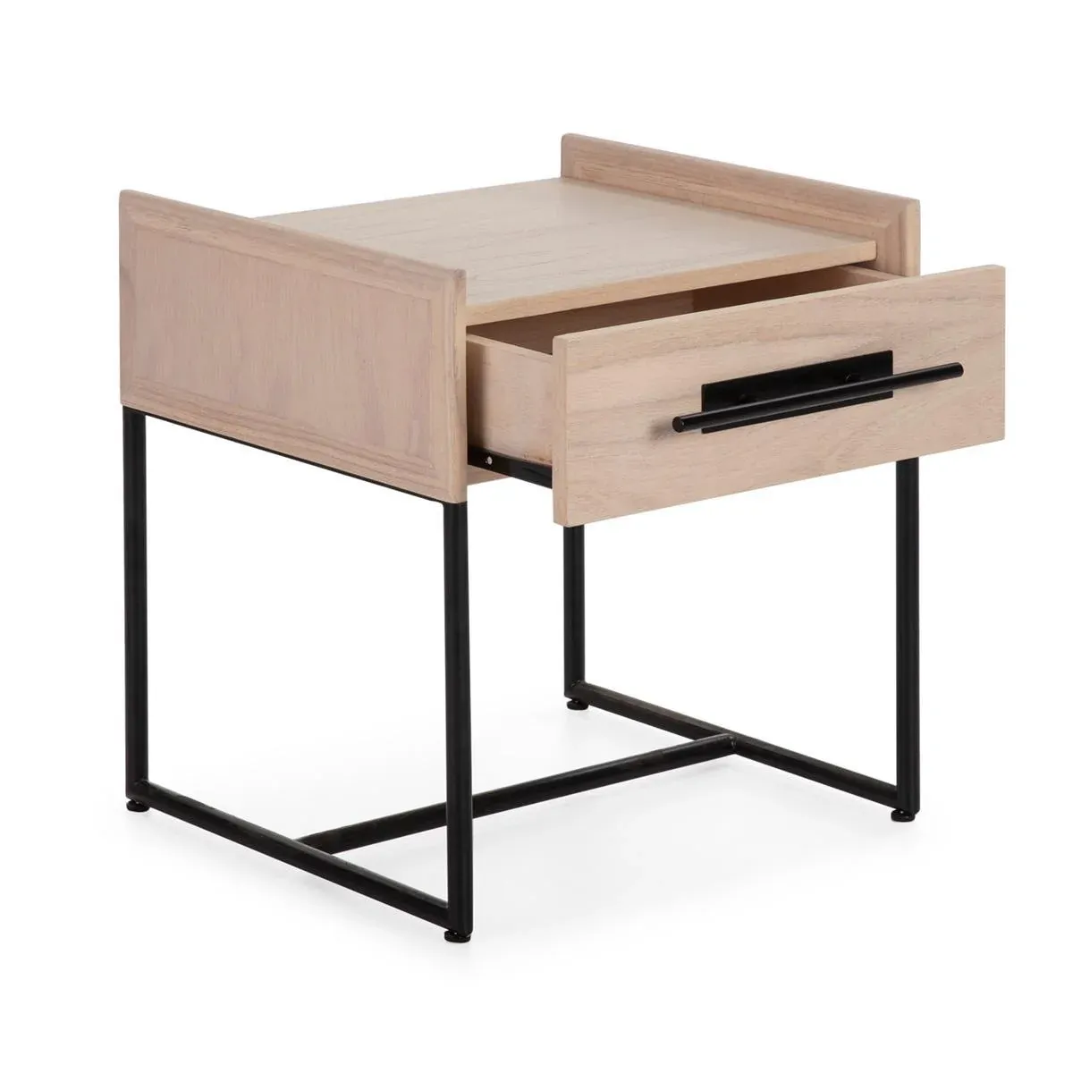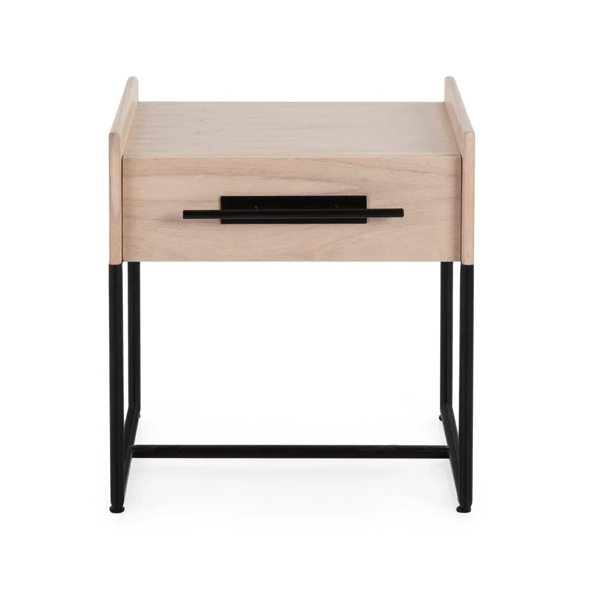 Mesita de noche de madera procedente de bosques sostenibles en color natural, y tiradores de metal en color negro.