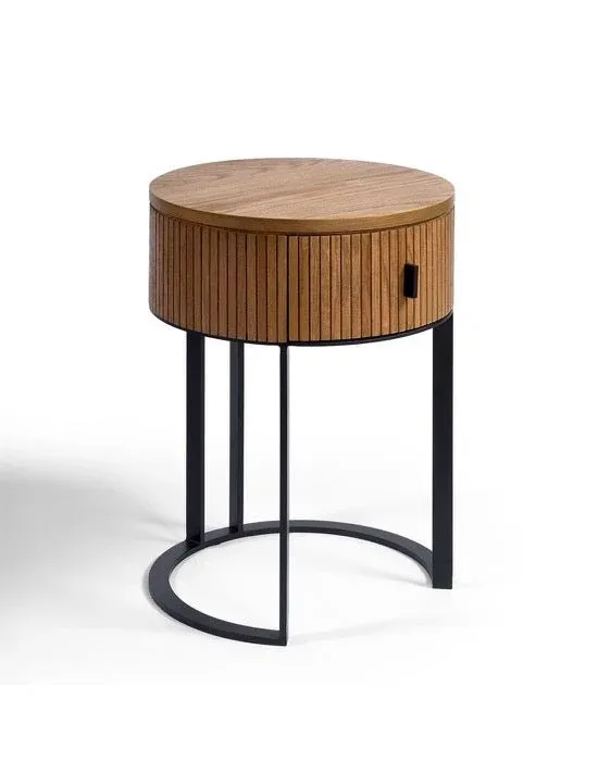 Mesita de noche redonda acabada en madera de roble natural efecto alistonado y estructura de metal dorado envejecido o negro. Cuenta con un cajón con tirador en el mismo metal en la parte frontal. Un diseño sencillo y de líneas curvas que aportan armonía para ambientes de relax en el hogar como puede ser el dormitorio.