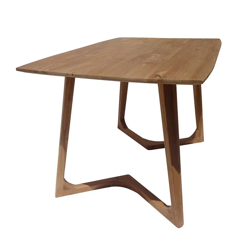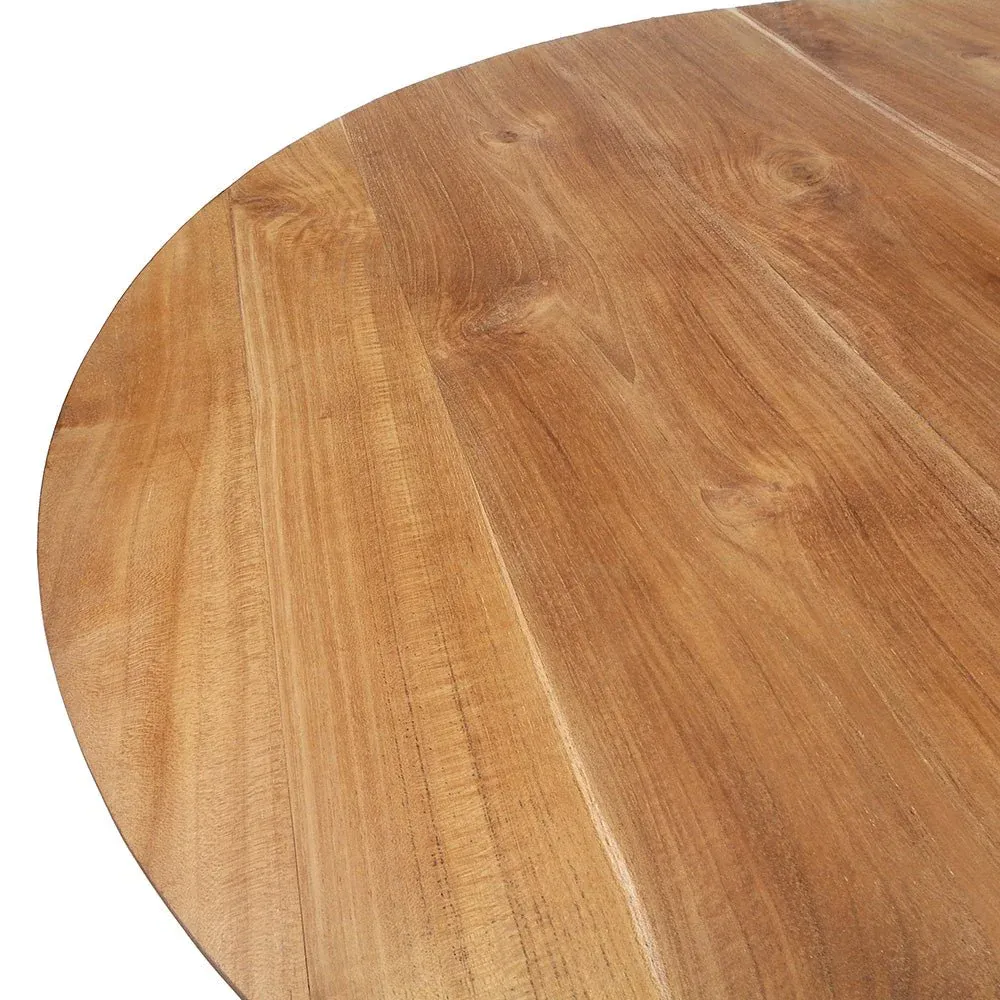 Mesa de comedor redonda y rectangular fabricada en madera de teca color natural.