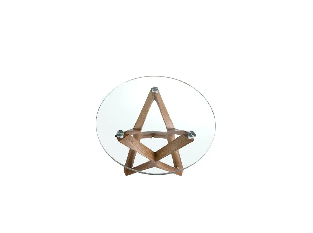 Mesa comedor de estilo moderno con tapa fija redonda de cristal templado con base de listones ovalados de madera  color nogal.