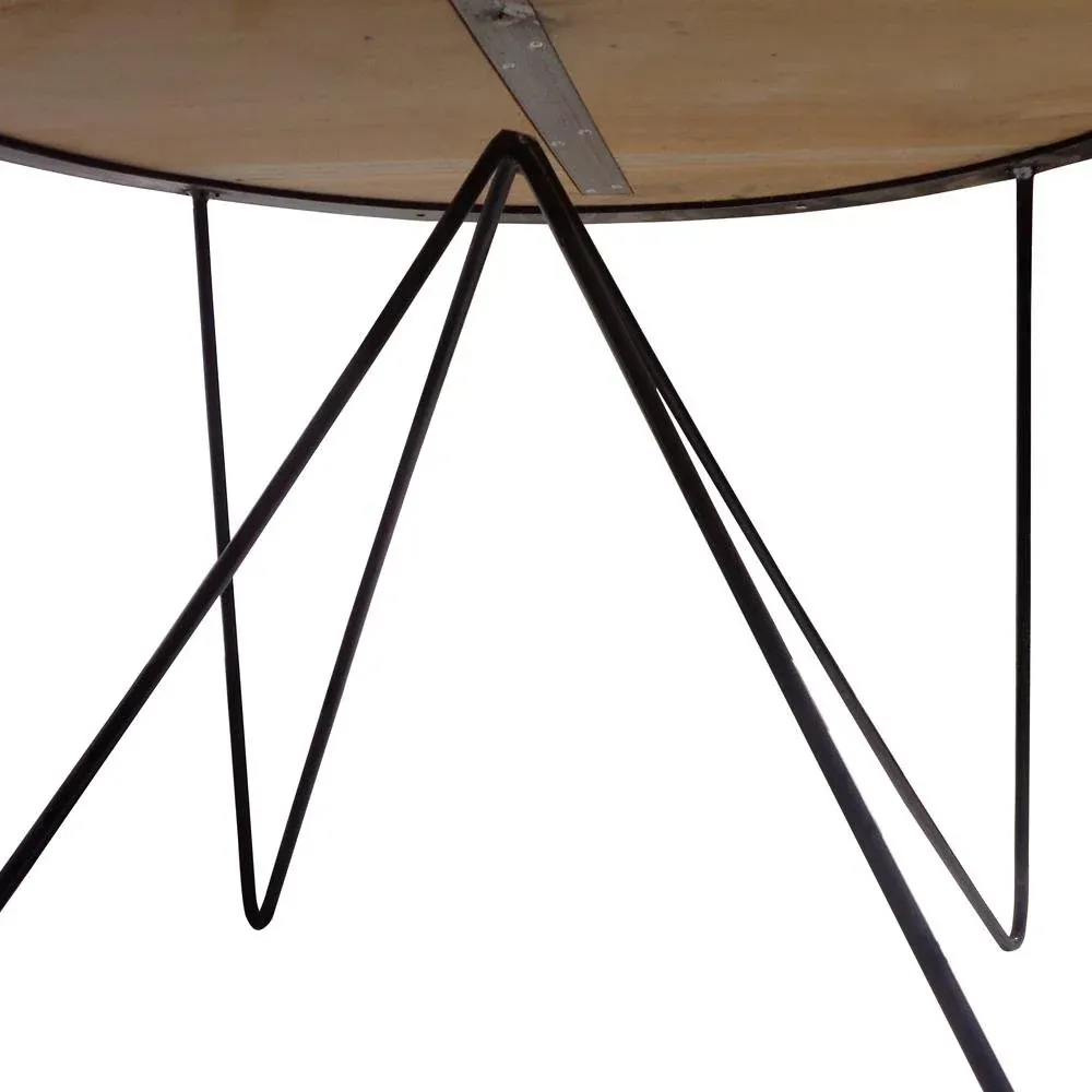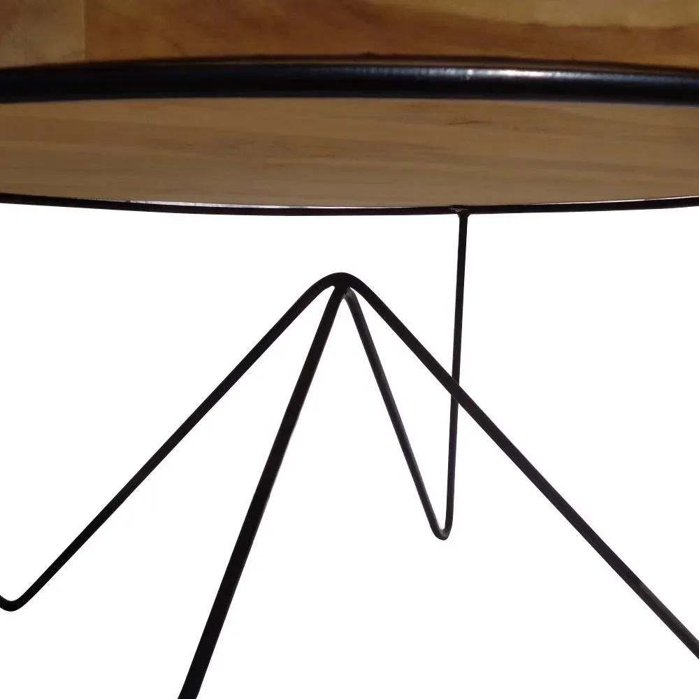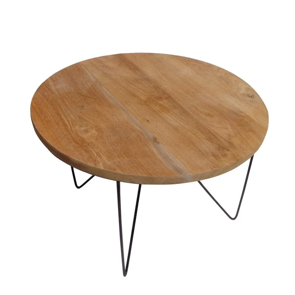 Mesa de centro o auxiliar circular de madera de teca natural sobre una estructura de hierro negro. Disponible en dos tamaños diferentes.