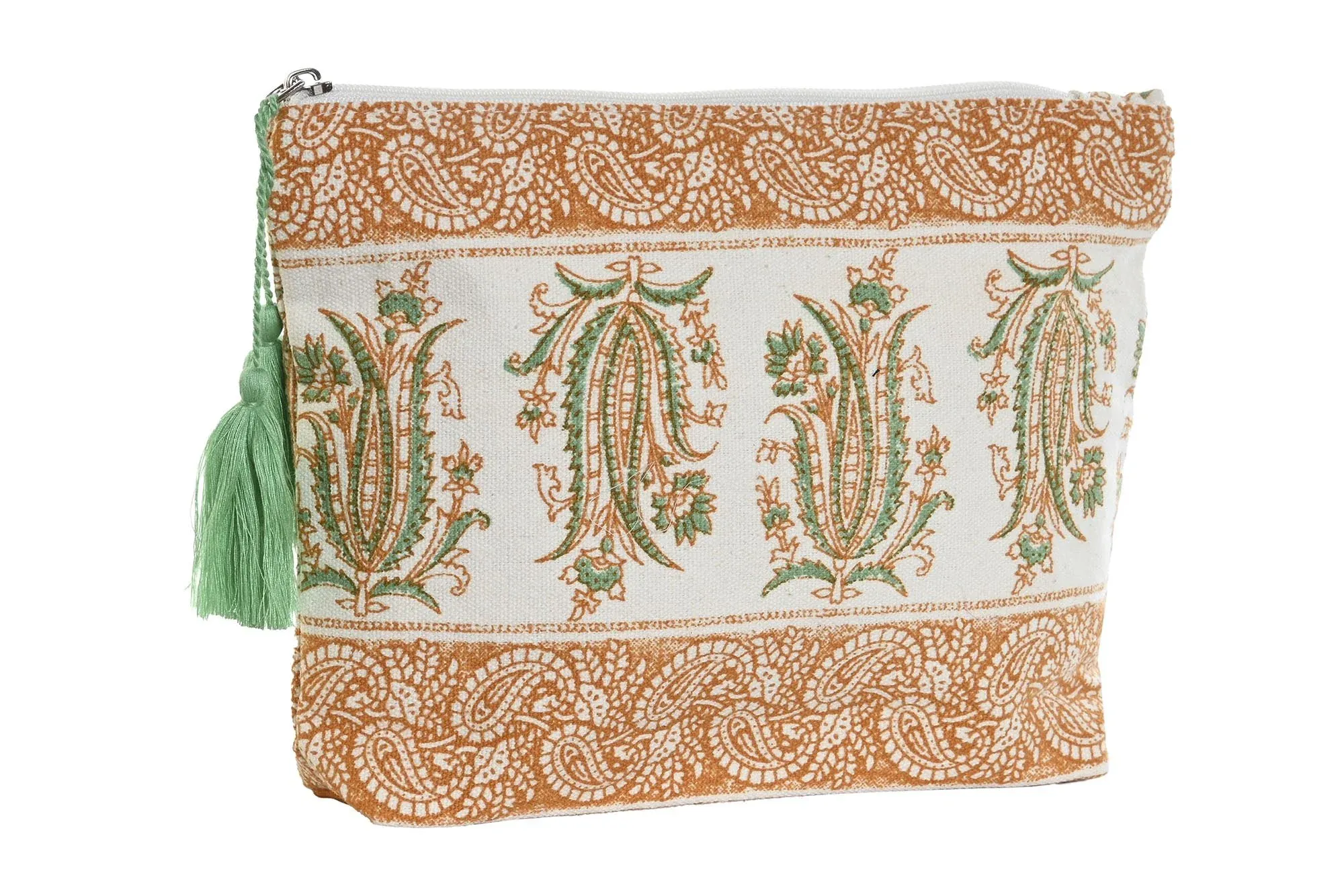Mini neceser con cremallera en la parte superior y pequeña asa de cordón de color crudo en el lateral. Con tejido con estampado étnico en tonos cálidos. Cada articulo puede tener una variación en el estampado, dependiendo de donde se haya efectuado el corte de la pieza. Forrado de tejido grueso de color gris en la parte interior. Para su correcto mantenimiento se aconseja lavarlo en frío a mano y no utilizar secadora.