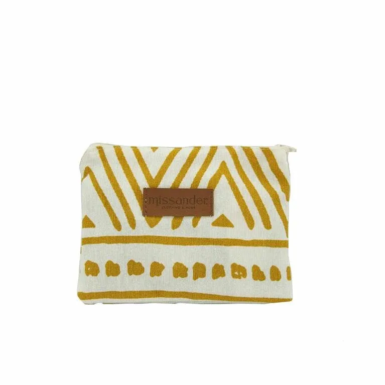 Estupendo monedero fabricado en loneta con dibujos étnicos de color azul, amarillo y gris con cierre de cremallera.