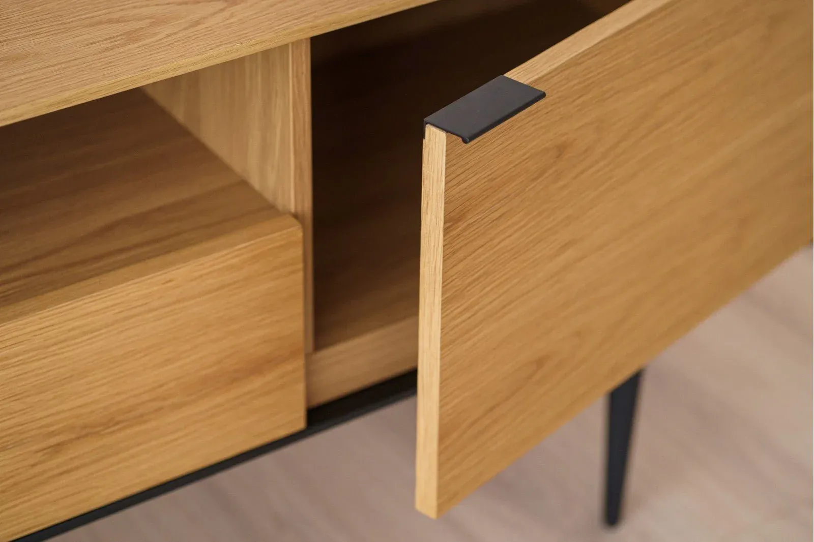 Precioso mueble de televisión realizado en DM rechapado en madera de roble con acabado mate natural. Las patas y los tiradores en forma de pletina son de metal de color negro y acabado mate. Dispone de dos puertas y un cajón central, su diseño de líneas redondeadas van acordes para los espacios diseñados contemporáneos.