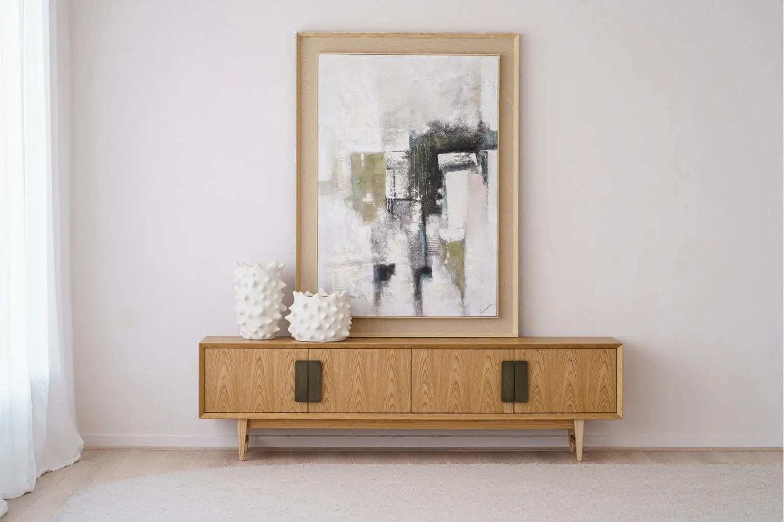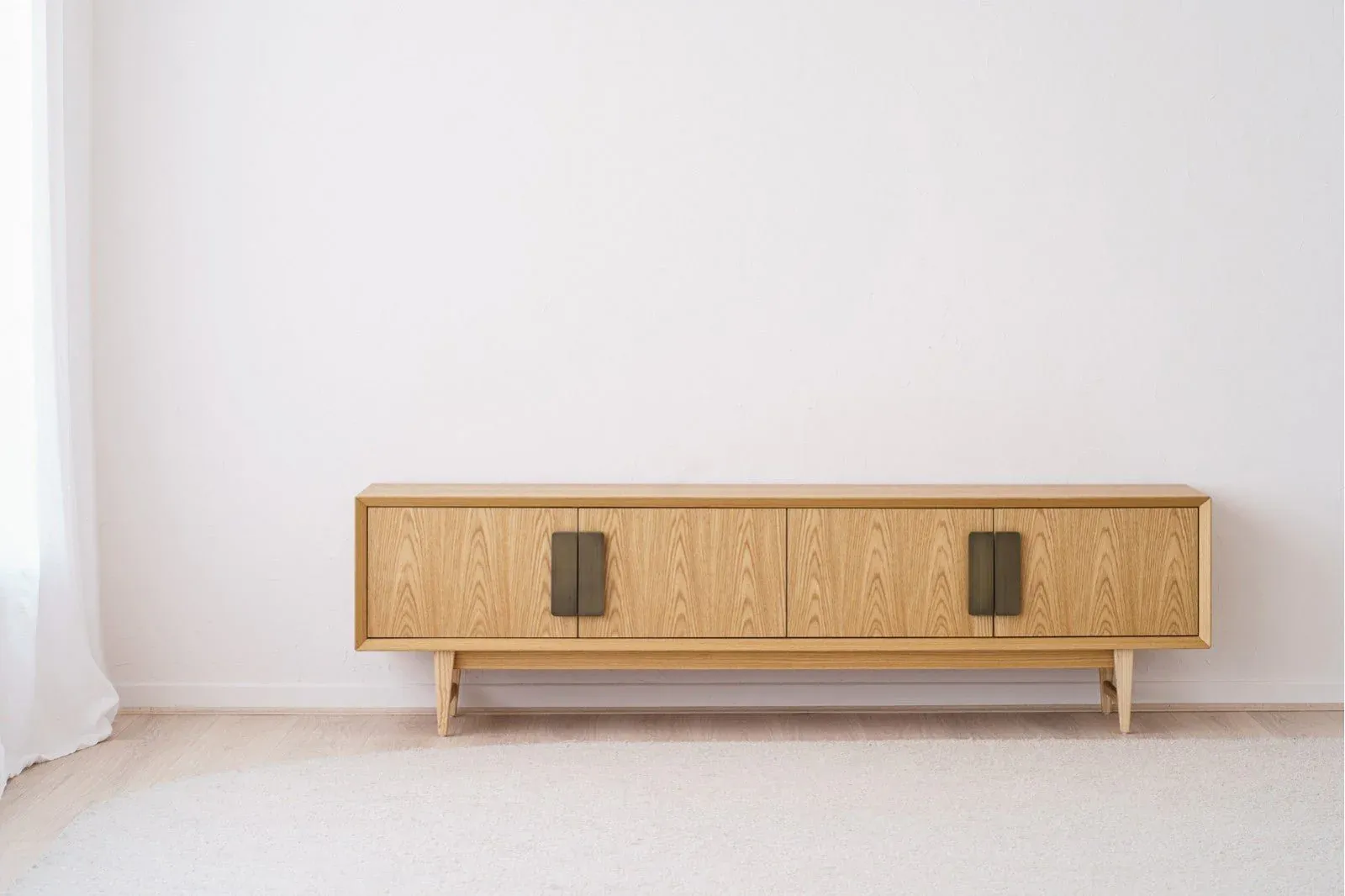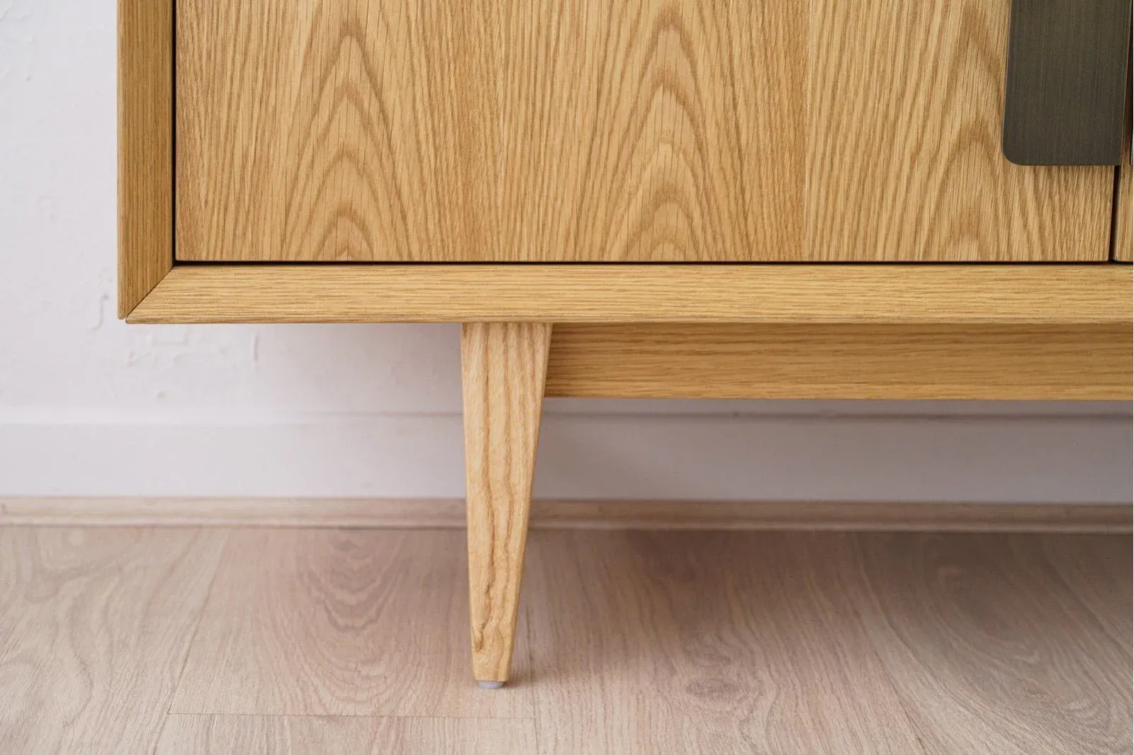 Precioso mueble de televisión realizado en tablero DM, rechapado en madera de roble de acabado mate natural. Las patas son de madera de roble maciza, tiene cuatro puertas y los tiradores son metálicos, aportaran una mezcla perfecta de naturalidad para su espacio.