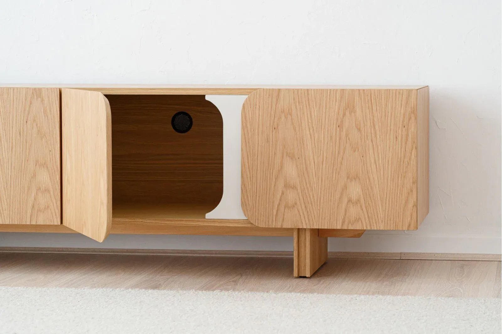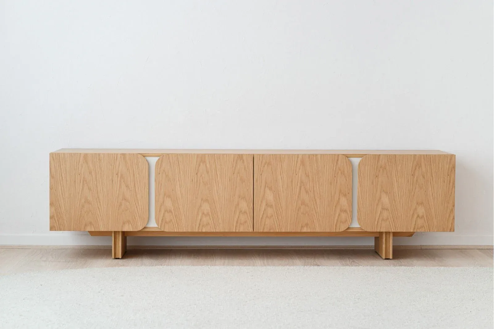 Precioso mueble de televisión de 4 puertas realizado en DM rechapado en roble natural acabado mate con detalles lacados en tono gris arena y mate. Requiere montaje