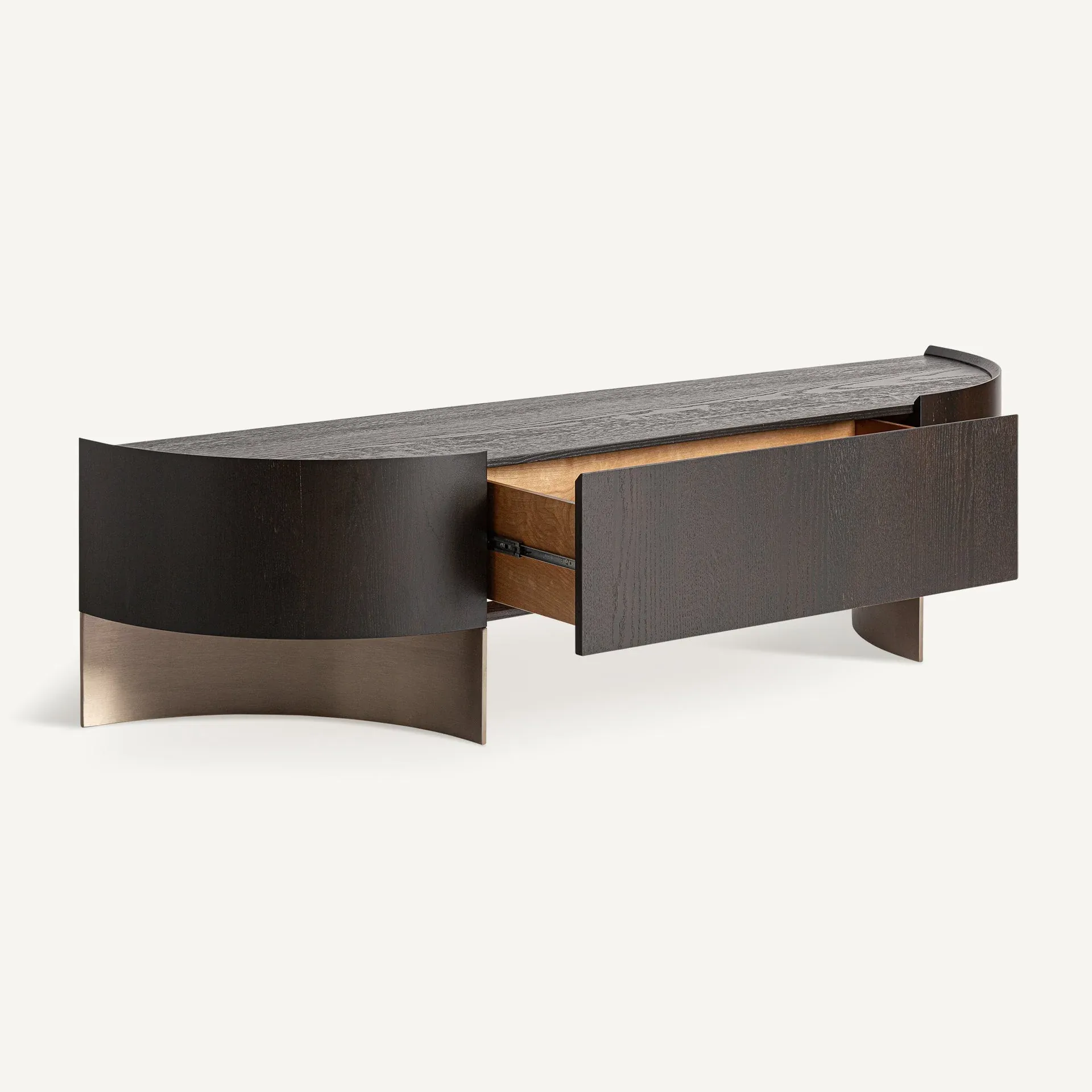 Mueble TV fabricado en madera de roble de forma artesanal, de color marrón combinado con bronce, estilo art deco.