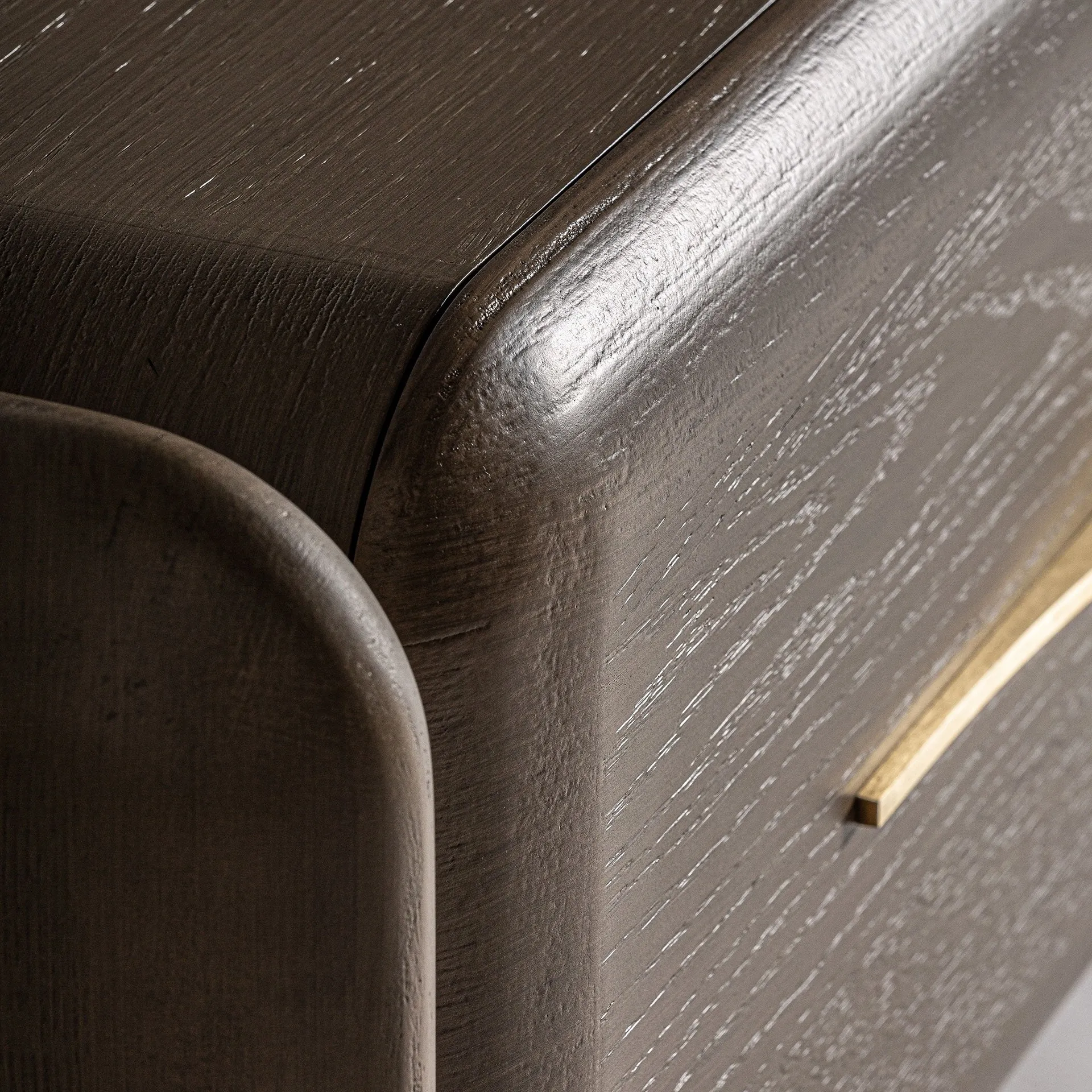 Mueble de TV de fabricación artesanal en madera de roble en color marrón combinado con latón oro.