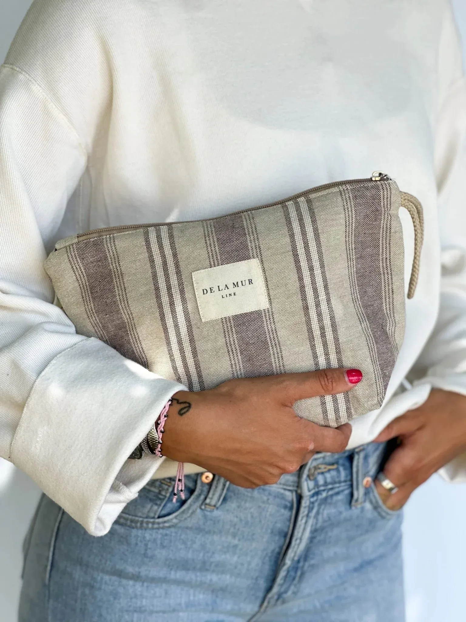 Neceser con cremallera en la parte superior y asa de cordón de color beige en el lateral. Con tejido fino a rayas en tono beige y marrón. Forrado de tejido grueso de color gris en la parte interior. Para su correcto mantenimiento se aconseja lavarlo en frío a mano y no utilizar secadora.
