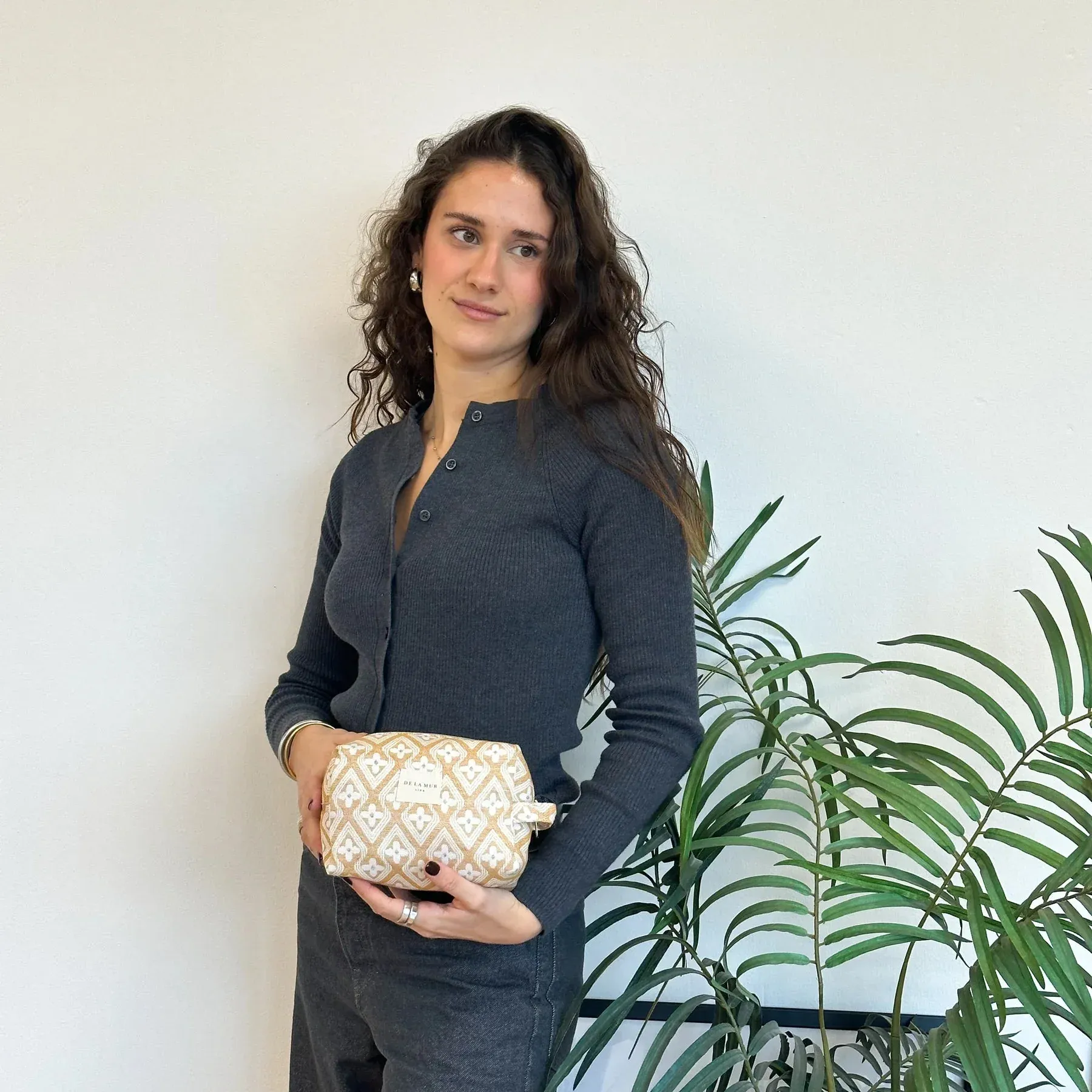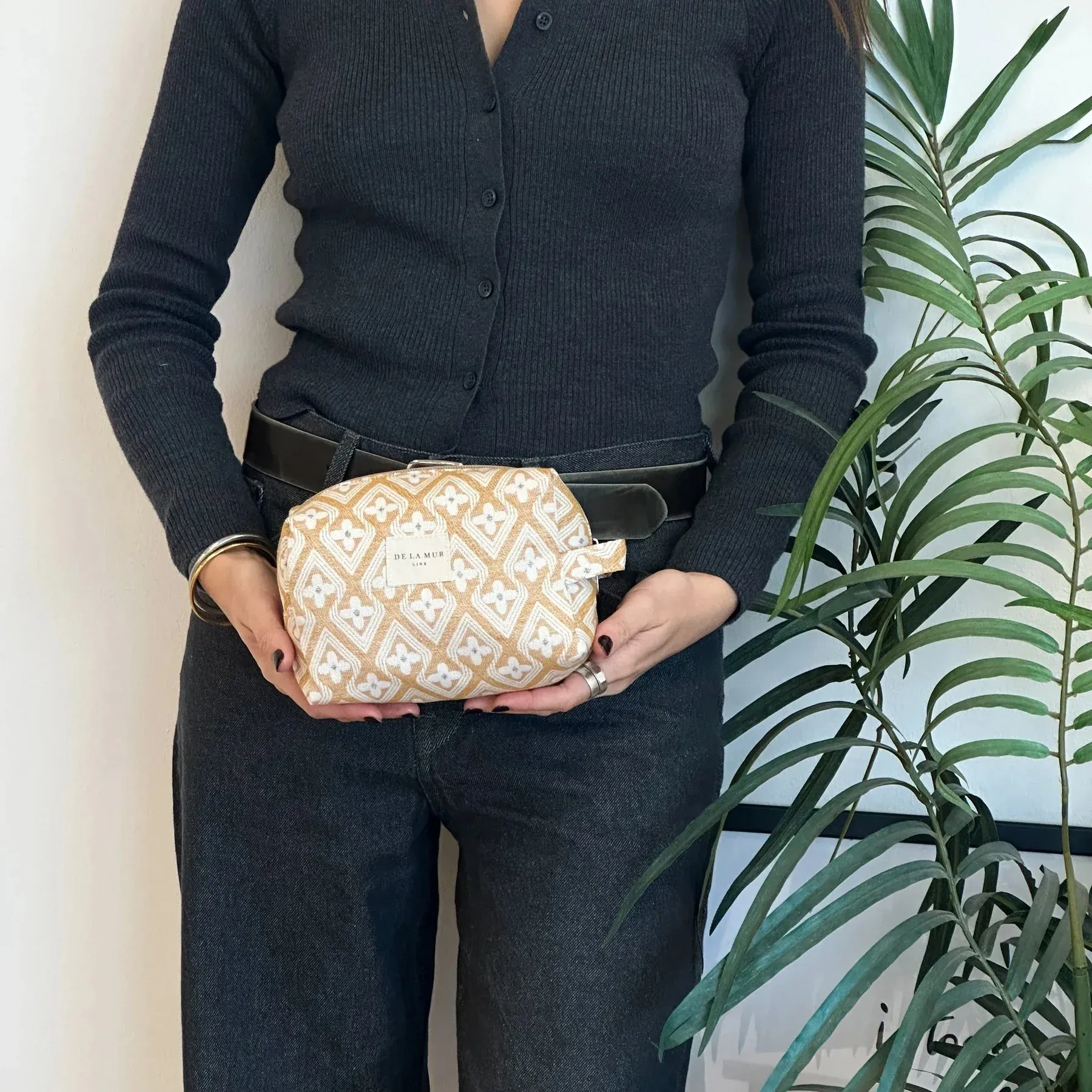 Neceser mediano con cremallera en la parte superior y con asa lateral. Con tejido con estampado geométrico de color mostaza. Para su correcto mantenimiento se aconseja lavarlo en frío y no utilizar secadora.