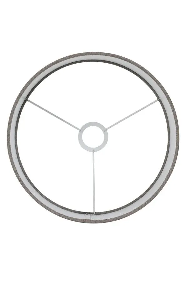 Pantalla de tela cilíndrica en colores beige y marrón.