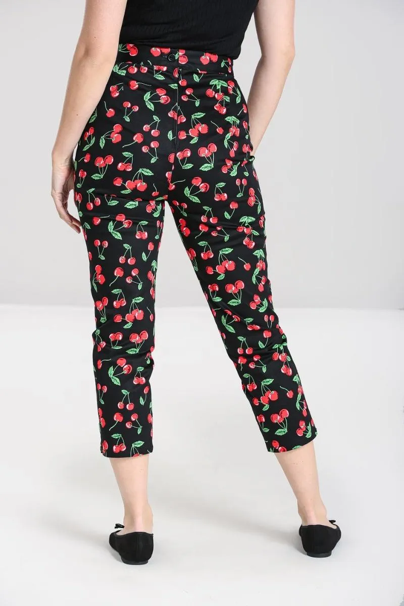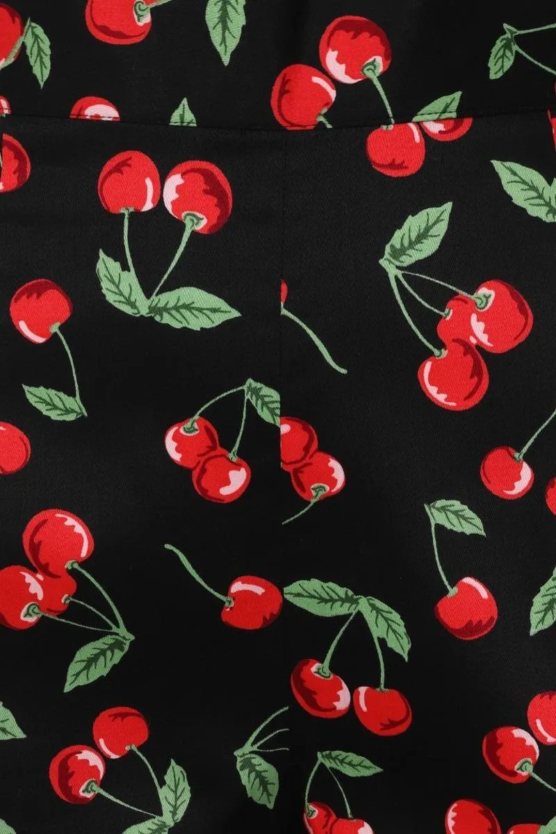 Pantalon pitillo con estampado de cerezas. Muy bonito y suave. Tiro alto con cremallera trasera.