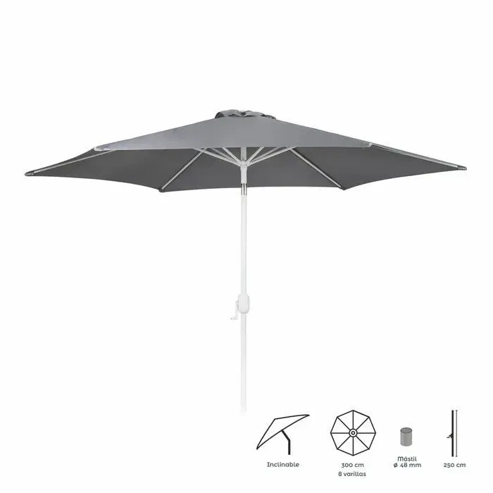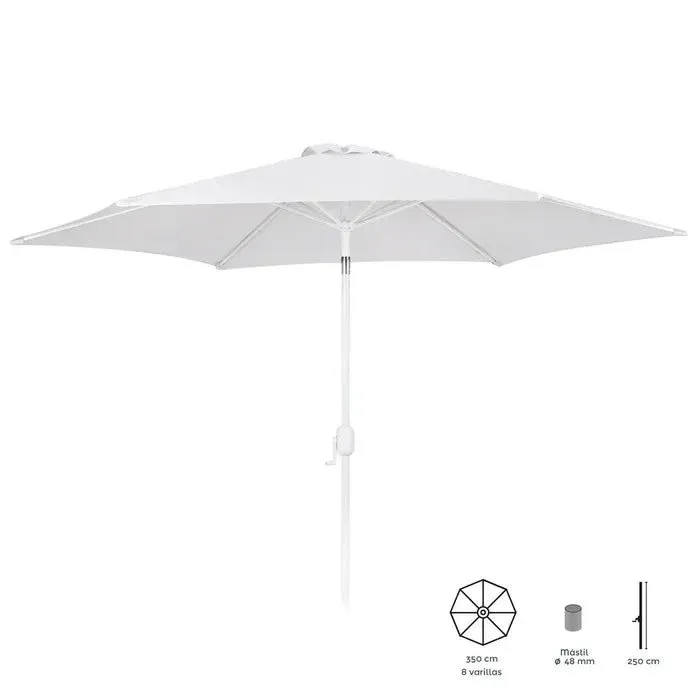 Precioso parasol con mástil fabricado en aluminio y poliéster con manivela y ocho varillas. Disponible en blanco, marrón y gris.